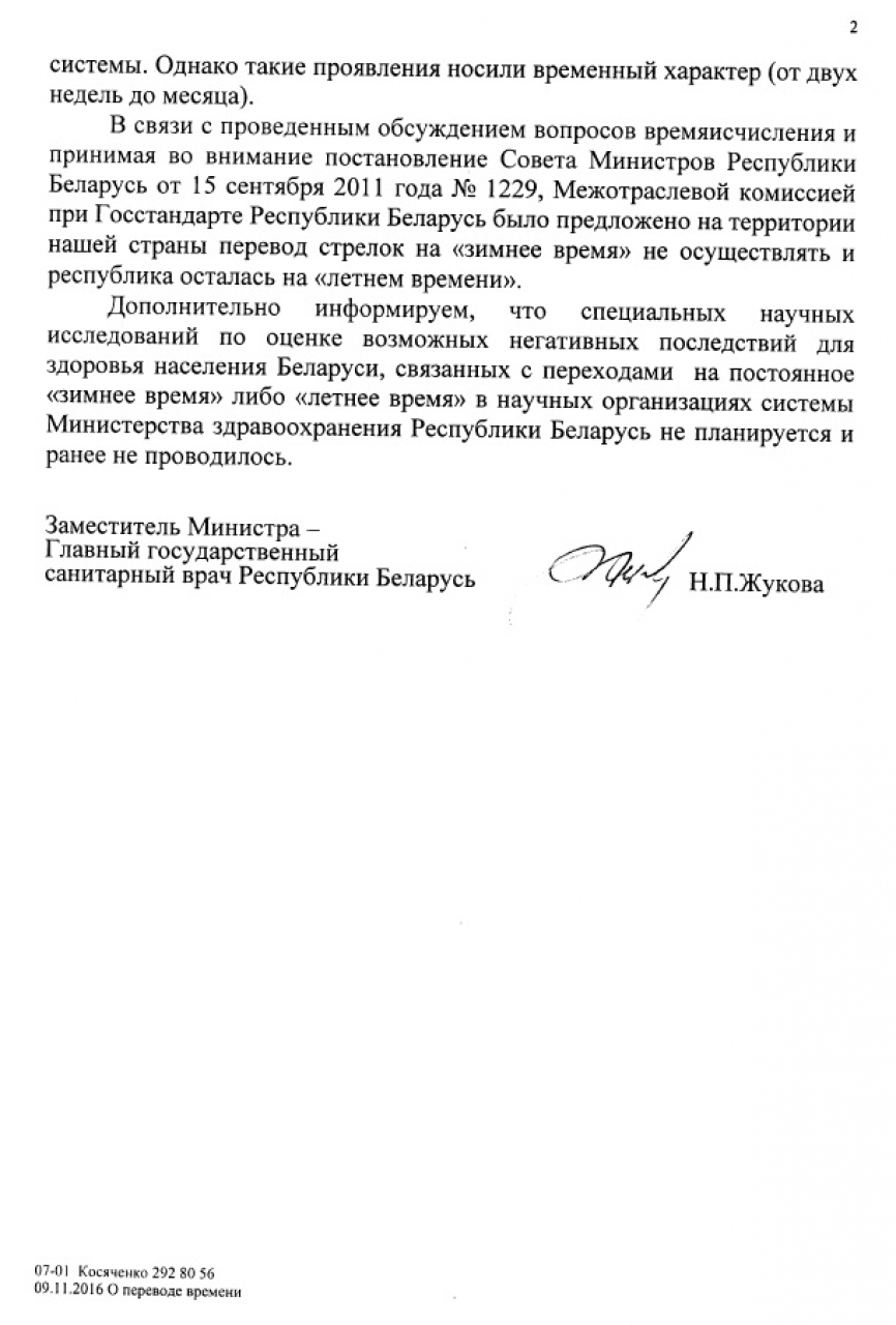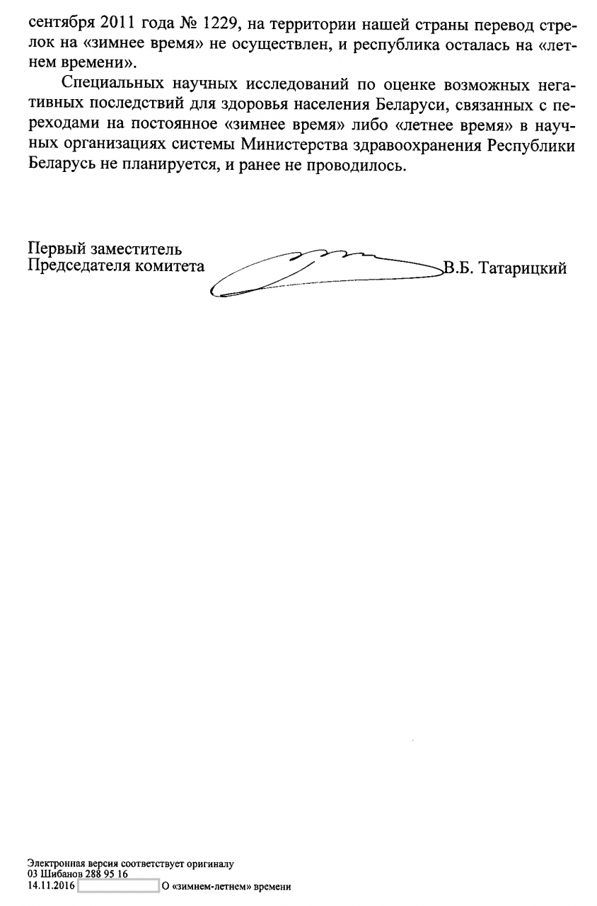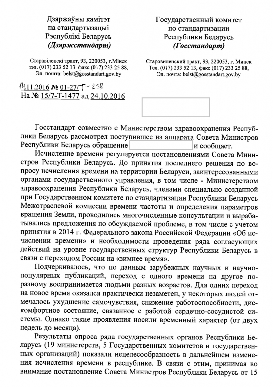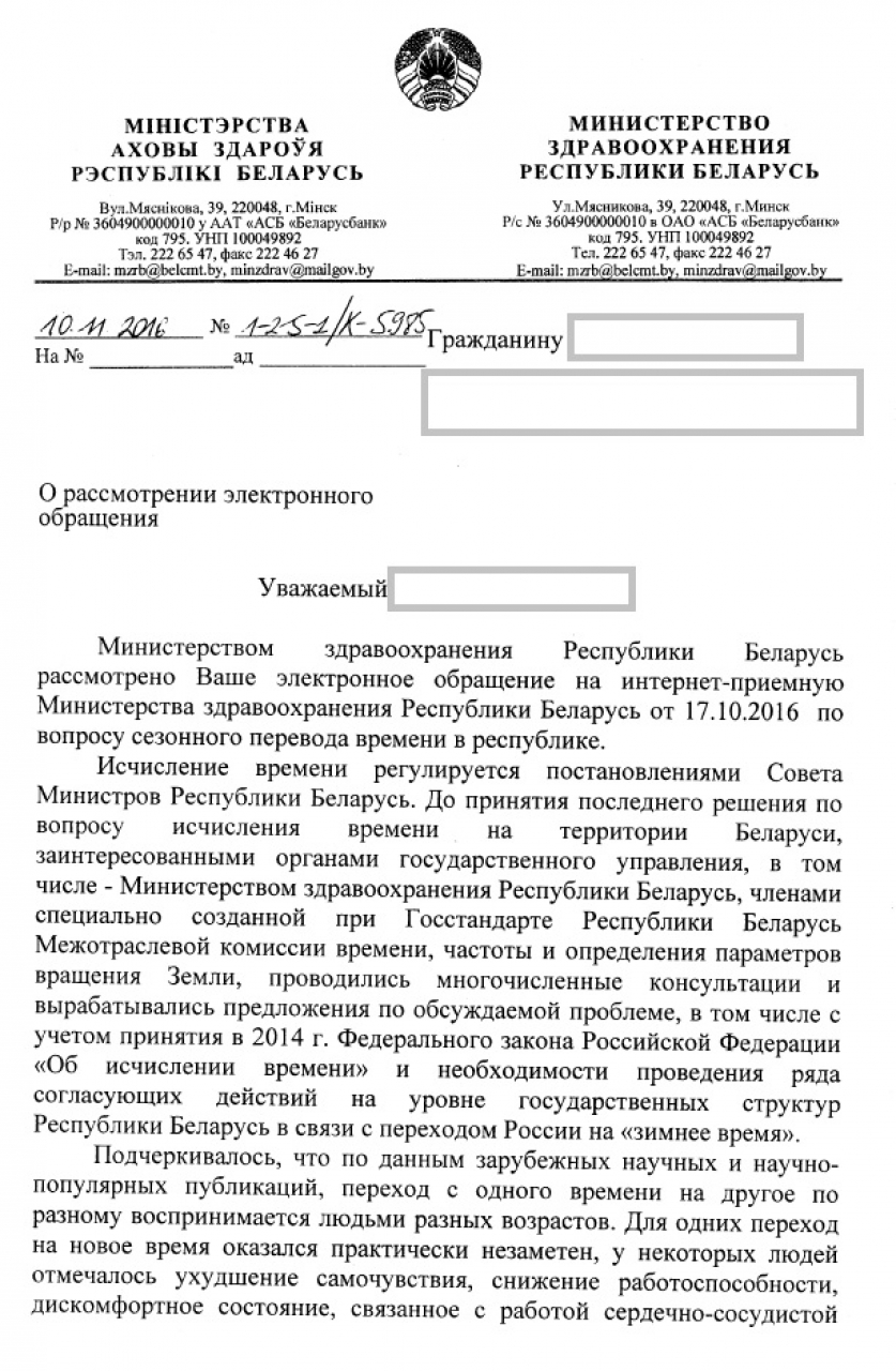 Беларусь географически находится в часовом поясе, соответсвующем Вильнюсу и Киеву. Перевод времени с летнего на зимнее обусловлен не только экономически (сохранение электроэнергии и т.п.), но и, самое главное, фактором здоровья человека, особенно детей. Пару лет назад правительство Беларуси отказалось от этой практики, установив часовой пояс и "закрепив" его на уровне Москвы. Тогдашний премьер-министр М.Мясникович обосновывал это решение Совмина каким-то исследованием Академии Наук РБ, которое нигде не было опубликовано. Однако человеческий организм является частью экосистемы, зависимой от периодов восхода и захода солнца. В итоге дети зимой встают и приходят в школу еще затемно, солнце появляется только после 9:00. Отсюда сонливость, раздражительность, усталость. Это в полной мере касается и взрослых. Предлагаем вернуться к практике перевода стрелок часов на час назад/вперед осенью и весной.