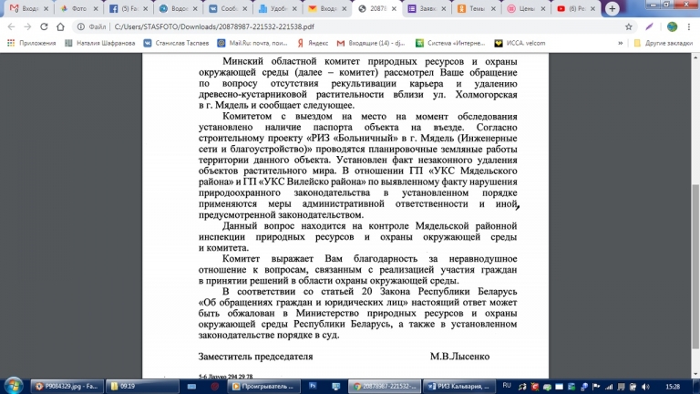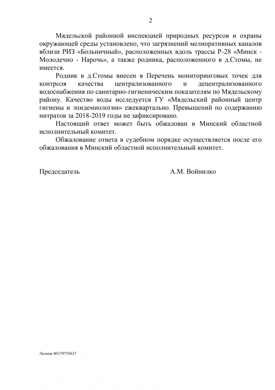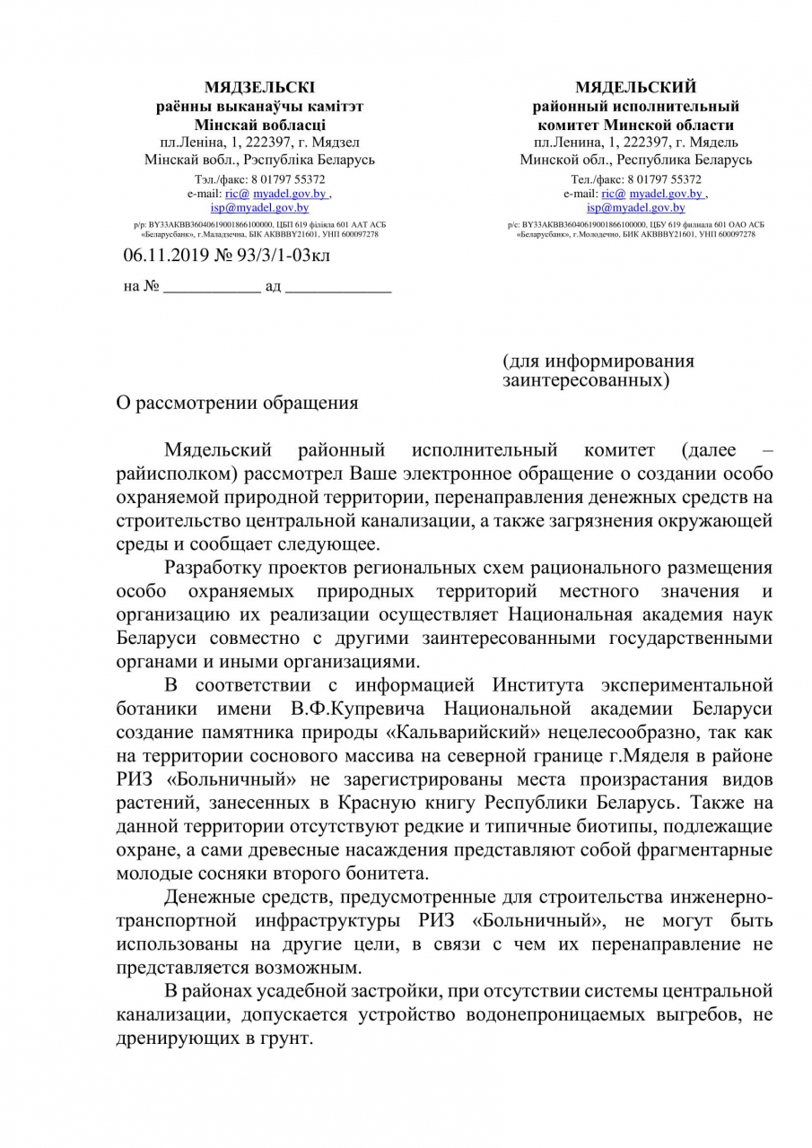 Также просим перенаправить средства на запланированное проведение коммуникаций в данном сосновом массиве вблизи окраины г.Мядель, ул.Холмогорская рядом с уникальным озером Рудаково, для создания центральной канализации в районе РИЗ «Больничный», поскольку на данный момент из-за отсутствия таковой можно наблюдать загрязнение окружающей среды: эфтрофикация поверхностных вод мелиоративных каналов вдоль трассы Р28, загрязнение родника «Виктусёва крыницы», расположенных на склоне данного района и впадающих в озеро Мястро, что в данный момент можно заметить невооружённым глазом.