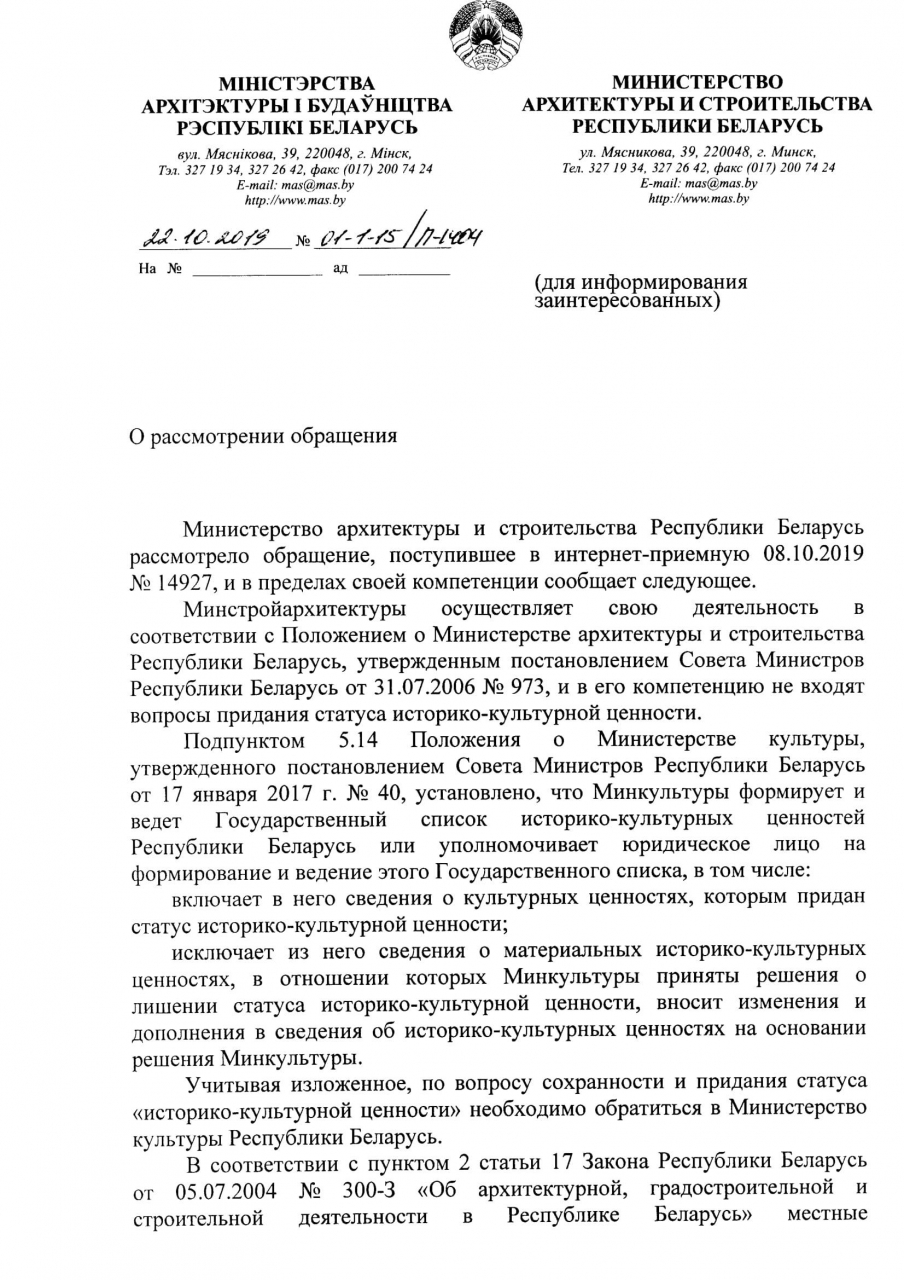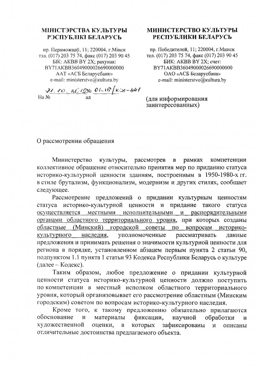 Мы, граждане Республики Беларусь, на основании Положения о Министерстве культуры, утвержденного постановлением Совета Министров Республики Беларусь от 17 января 2017 г. № 40, которым установлено, что Минкультуры осуществляет полномочия по охране историко-культурных ценностей, просим принять меры по приданию статуса историко-культурных ценностей зданиям построенным в стиле брутализм, функционализм, конструктивизм, модернизм, и всем не типовым постройкам позднего СССР (50-80х. гг.) на территории Республики Беларусь (производственные, общественные, жилые здания).