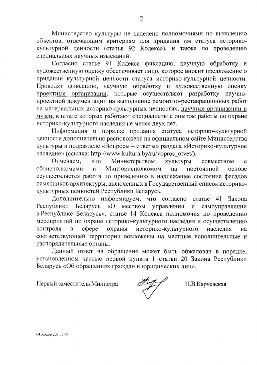 Предложение о придании культурной ценности статуса историко-культурной ценности должно поступить по компетенции в местный исполком областного территориальнго уровня, который организовывает его рассмотрение областным (Минским городским) советом по вопроасм историко-культурного наследия.