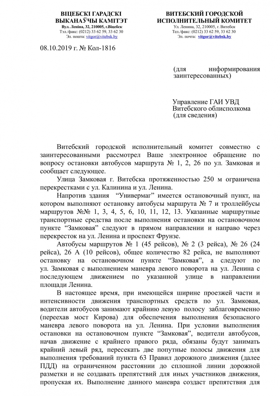 Предлагаем рассмотреть возможность организации остановочного пункта всех автобусов и троллейбусов у Витебского универмага в городе Витебске.
