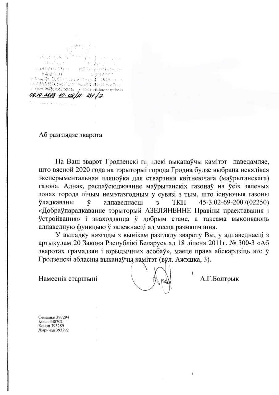 Выносячы пытанне на абмеркаванне ўвосень, мяркуем, што пры станоўчым разглядзе, затраты на новыя газоны могуць быць прадугледжаны ў бюджэце горада на 2020 год.