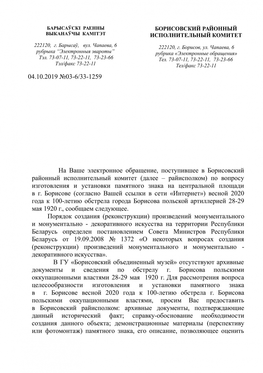 Для рассмотрения вопроса целесообразности изготовления и установки памятного знака в Борисове весной 2020 года к 100-летию обстрела Борисова польскими оккупационными властями, заявителям необходимо предоставить в Борисовский райисполком: архивные документы, подтверждающие данный исторический факт; справку-обоснование необходимости создания данного объекта; демонстрационные материалы (перспективу или фотомонтаж) памятного знака, его описание, позволяющее оценить его объемно-пространственное и градостроительное решение; источник финансирования.