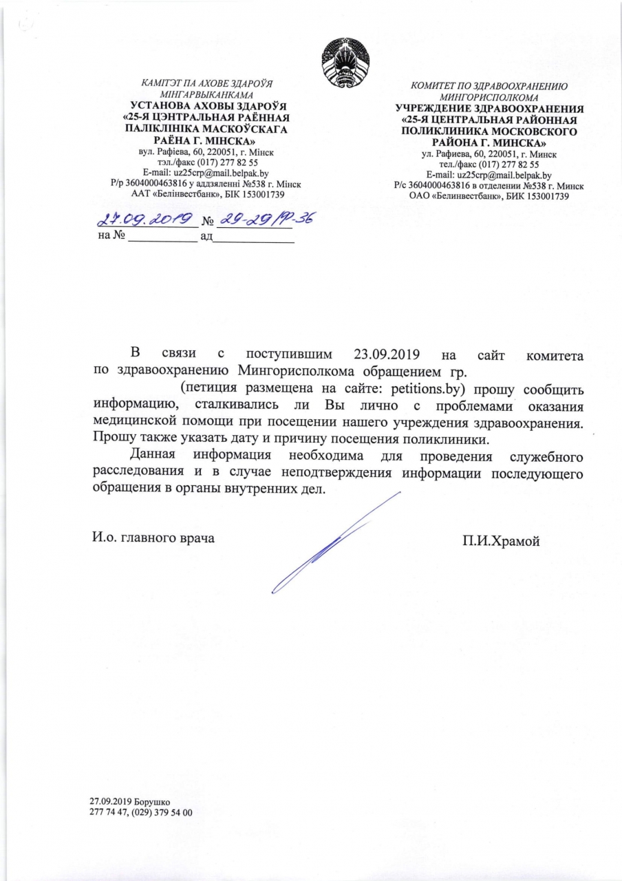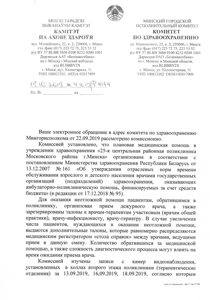Для рассмотрения обращения Комитетом по здравоохранению Мингорисполкома создана комиссия, встреча заявителей с которой состоится 2 октября 2019 г. в 15:00 в кабинете главного врача УЗ "25-я центральная районная поликлиника Московского района г.Минска".