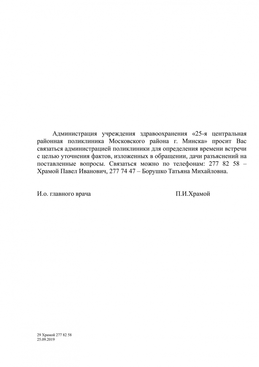 Просим решить указанные проблемы и ответить на содержащиеся в обращении вопросы. В случае непринятия мер по решению описанных проблем в 25-й центральной районной поликлиники Московского района г. Минска будем обращаться в вышестоящие государственные органы.