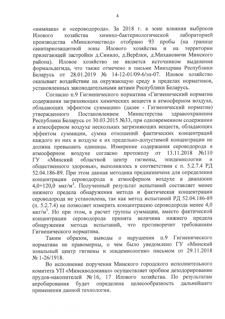 При том, что ГУ «Минский областной центр гигиены, эпидемиологии и общественного здоровья» установлено, что сумма отношений концентраций веществ и их ПДК с учётом пределов чувствительности методик по группе суммации аммиак-сероводород по некоторым адресам дер. Синило, превышает единицу, что вызвано увеличением выбросов веществ от илового хозяйства «Волма». Согласно письму Минздрава от 03.05.2019 №4-56/Б-2989 выявлены превышения гигиенических нормативов.