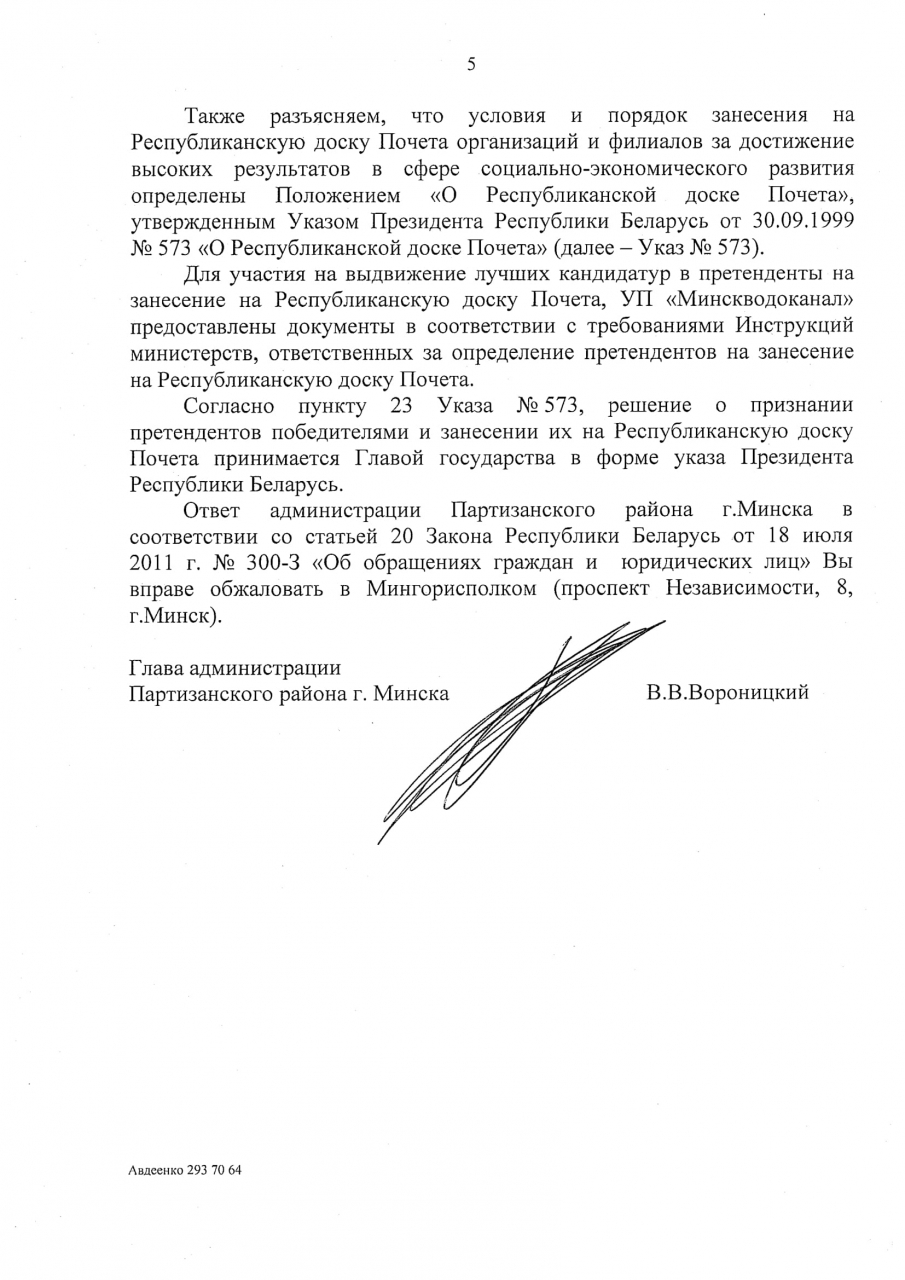 С учётом изложенного неясно каким образом УП "Минскводоканал" занесено на Республиканскую Доску почёта, учитывая, что туда заносятся организации и предприятия, обладающие общественным признанием и достижениями в социально-экономическом развитии.