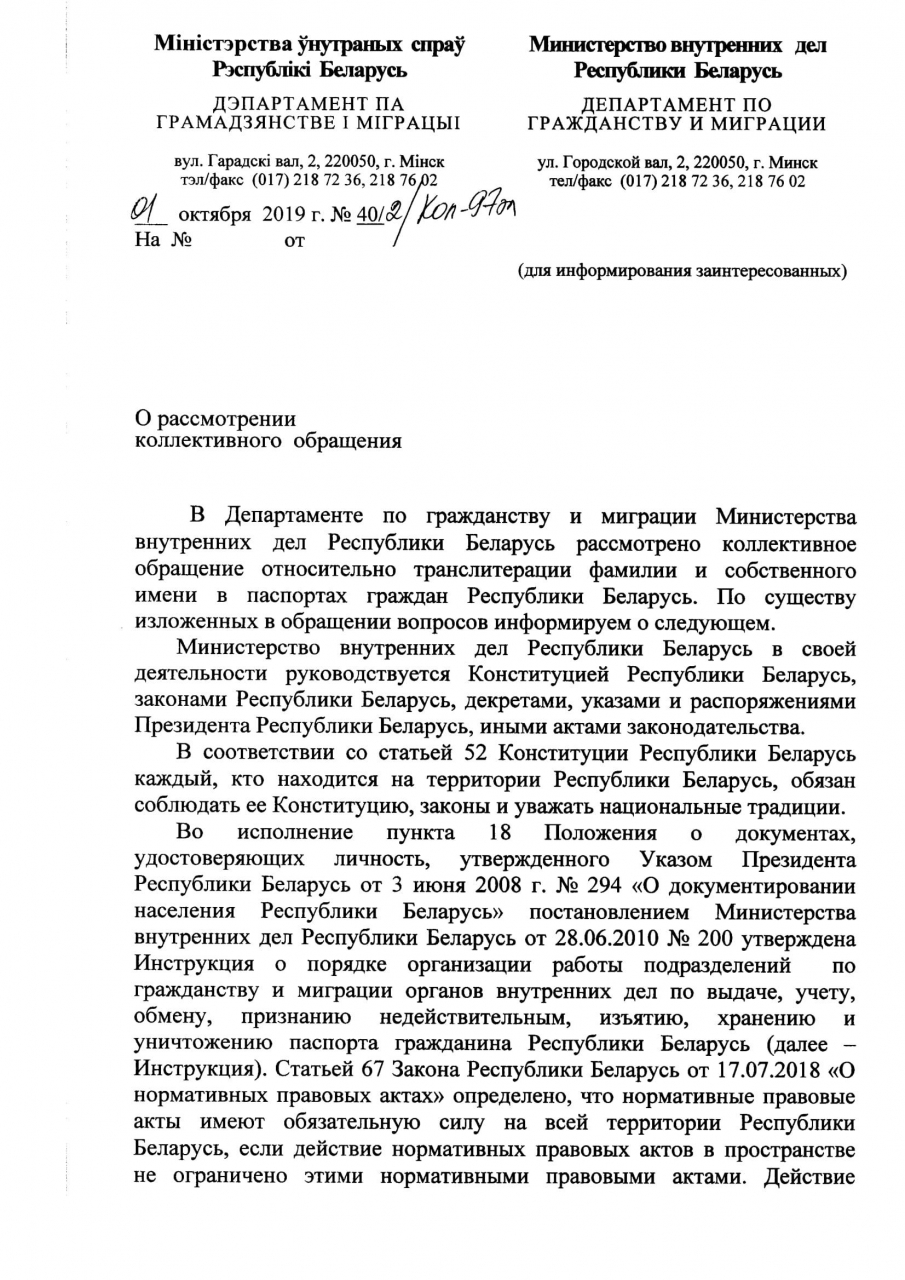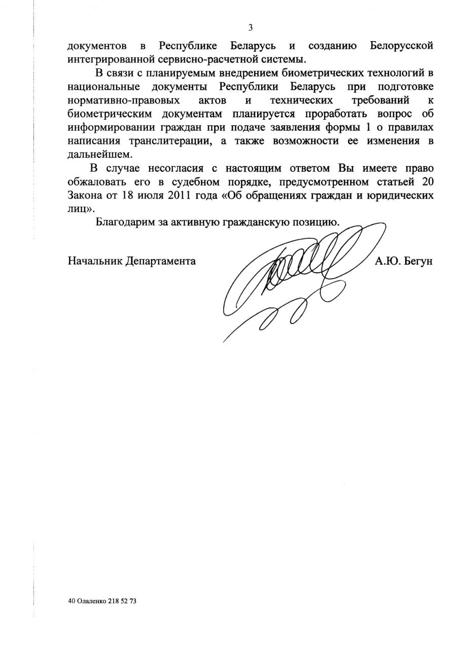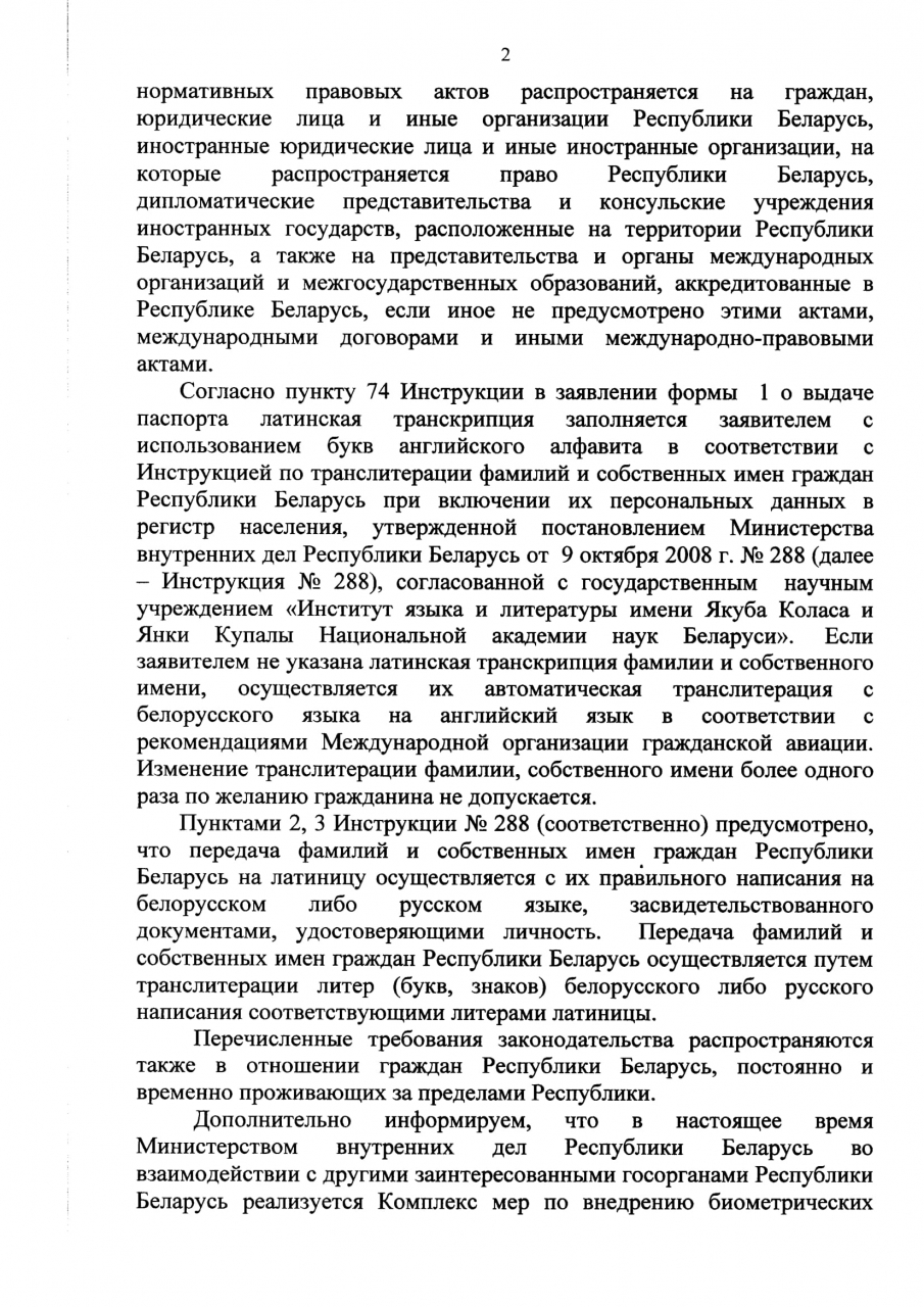 2. Использовать желаемую транслитерацию фамилии и собственного имени, если она указана в заявлении на выдачу паспорта в графе „Лацiнская транскрыпцыя“. Так как Инструкции № 200 и 288 являются ведомственными документами МВД, то они не могут быть обязательны к исполнению простыми гражданами. Правовой основой варианта написания латинскими буквами имени и фамилии граждан в паспорте является заявление, а именно указание варианта написания.