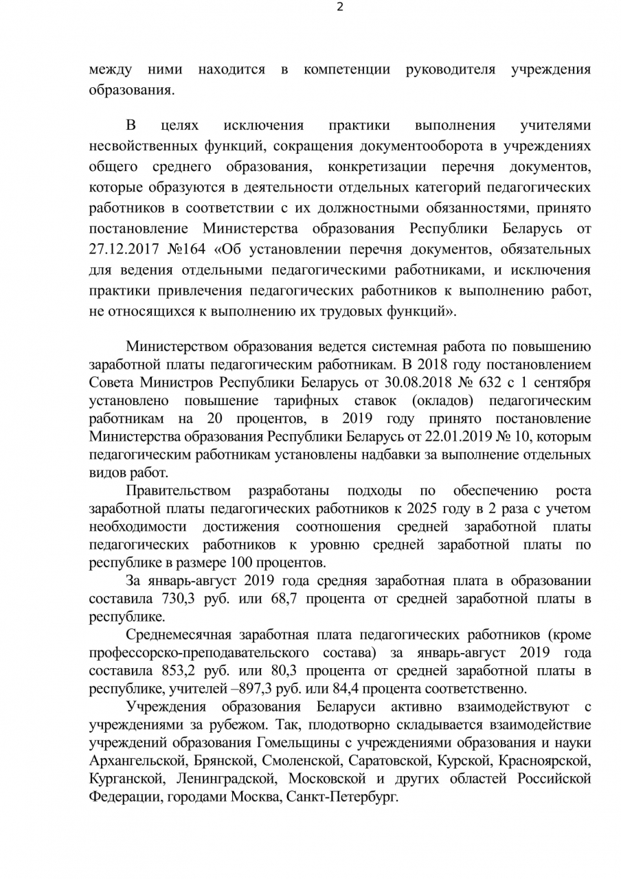 3) основательно разобраться в системной проблеме нашего образования - "бесправии" учителей при полной вседозволенности для учеников и родителей. Это подрывает как авторитет всех учителей Республики Беларусь, так и самого Министерства образования. Считаем, что первопричина такого положения учителей заключается в низкой оплате их наиважнейшего труда.