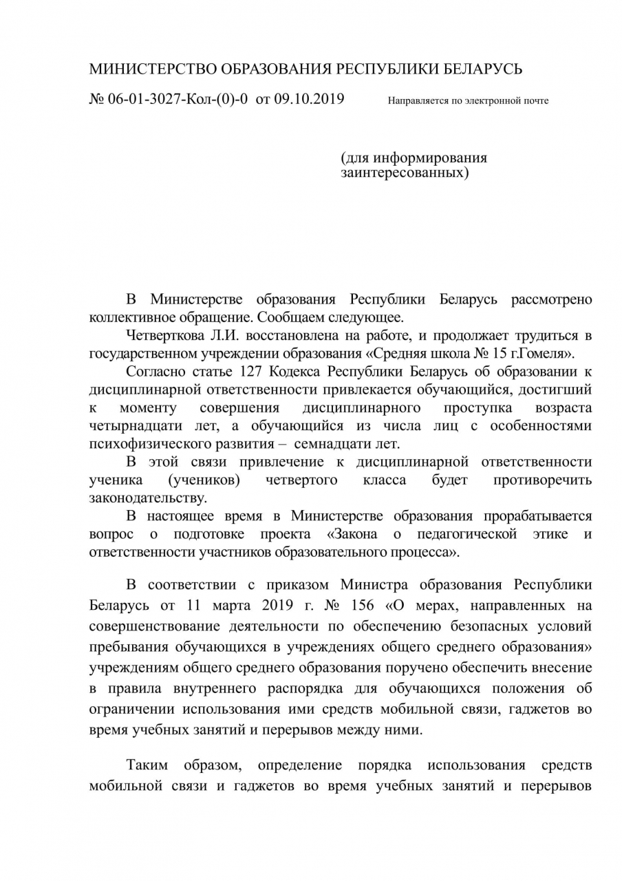 Четверткова Л.И. восстановлена на работе. Привлечение к дисциплинарной ответственности ученика (учеников) четвертого класса будет противоречить законодательству. Определение порядка использования средств мобильной связи и гаджетов во время учебных занятий и перерывов между ними находится в компетенции руководителя учреждения образования. В настоящее время в Министерстве образования прорабатывается вопрос о подготовке проекта «Закона о педагогической этике и ответственности участников образовательного процесса».