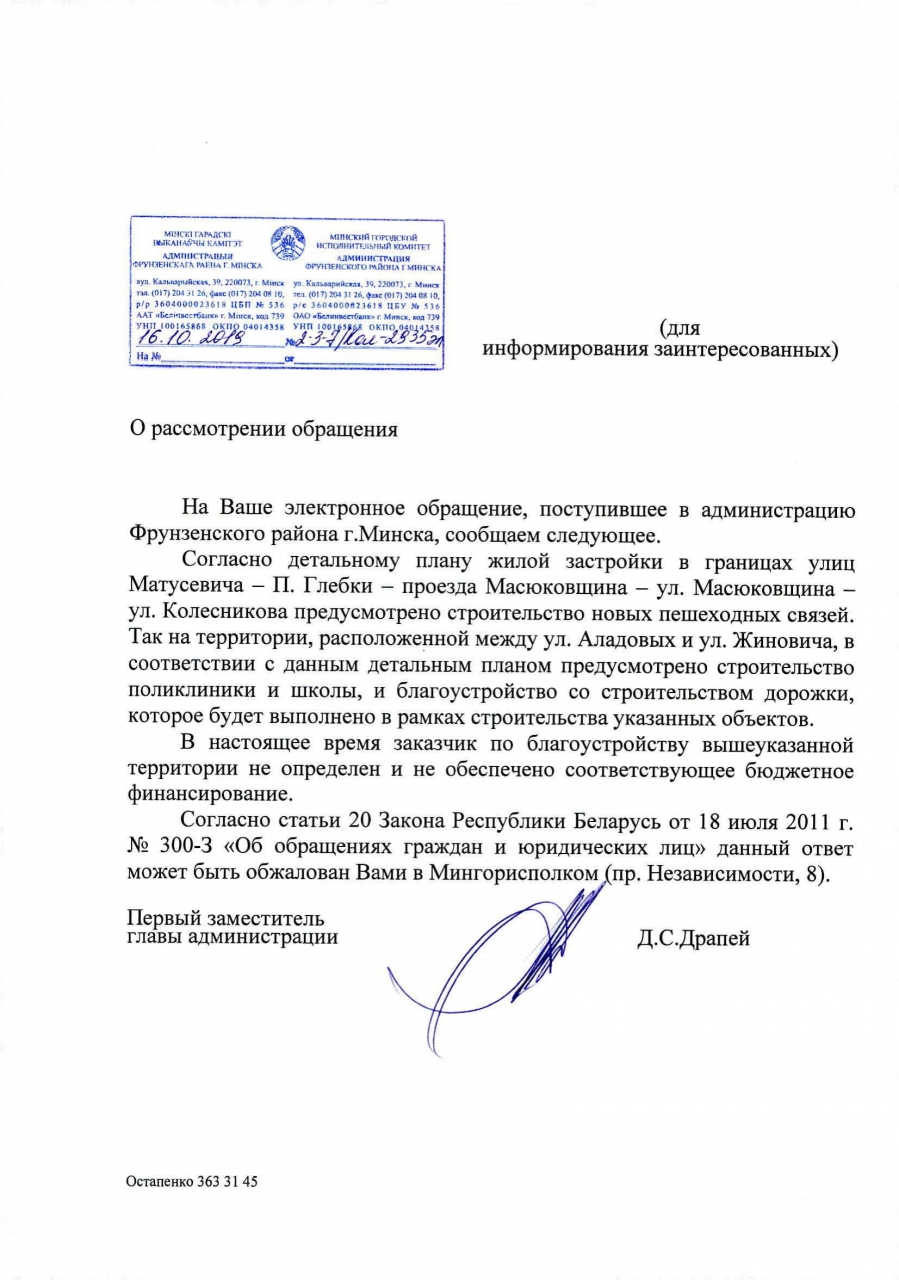На основании изложенного, просим принять меры по устройству твёрдого покрытия дорожки по пешеходному направлению от тротуара вдоль новостроек по ул. Аладовых до тротуара, ведущему к ул. И.Жиновича.