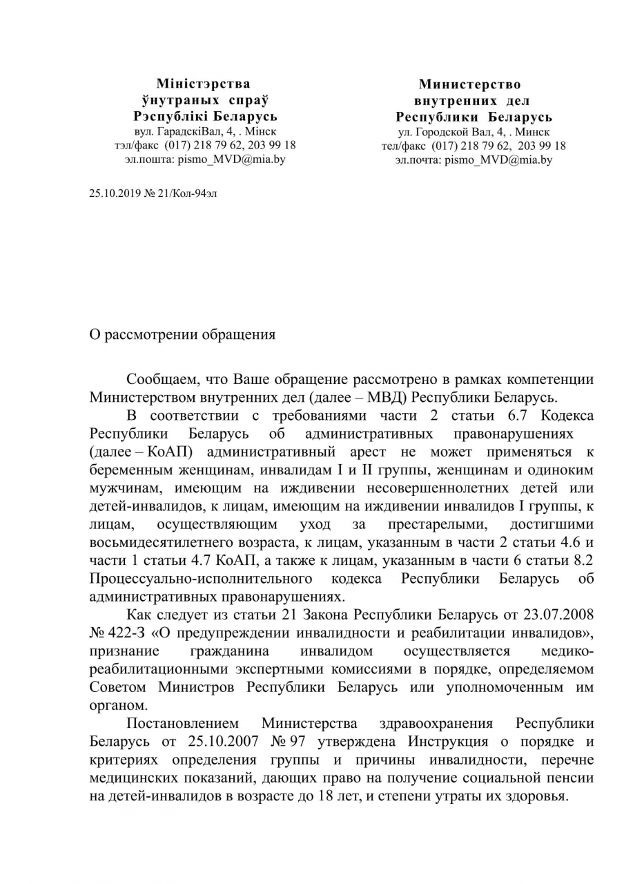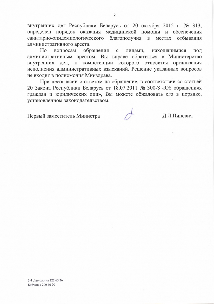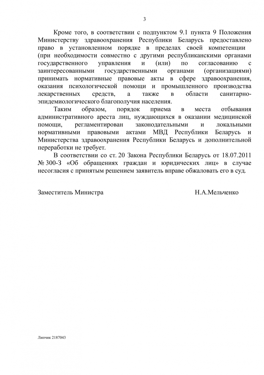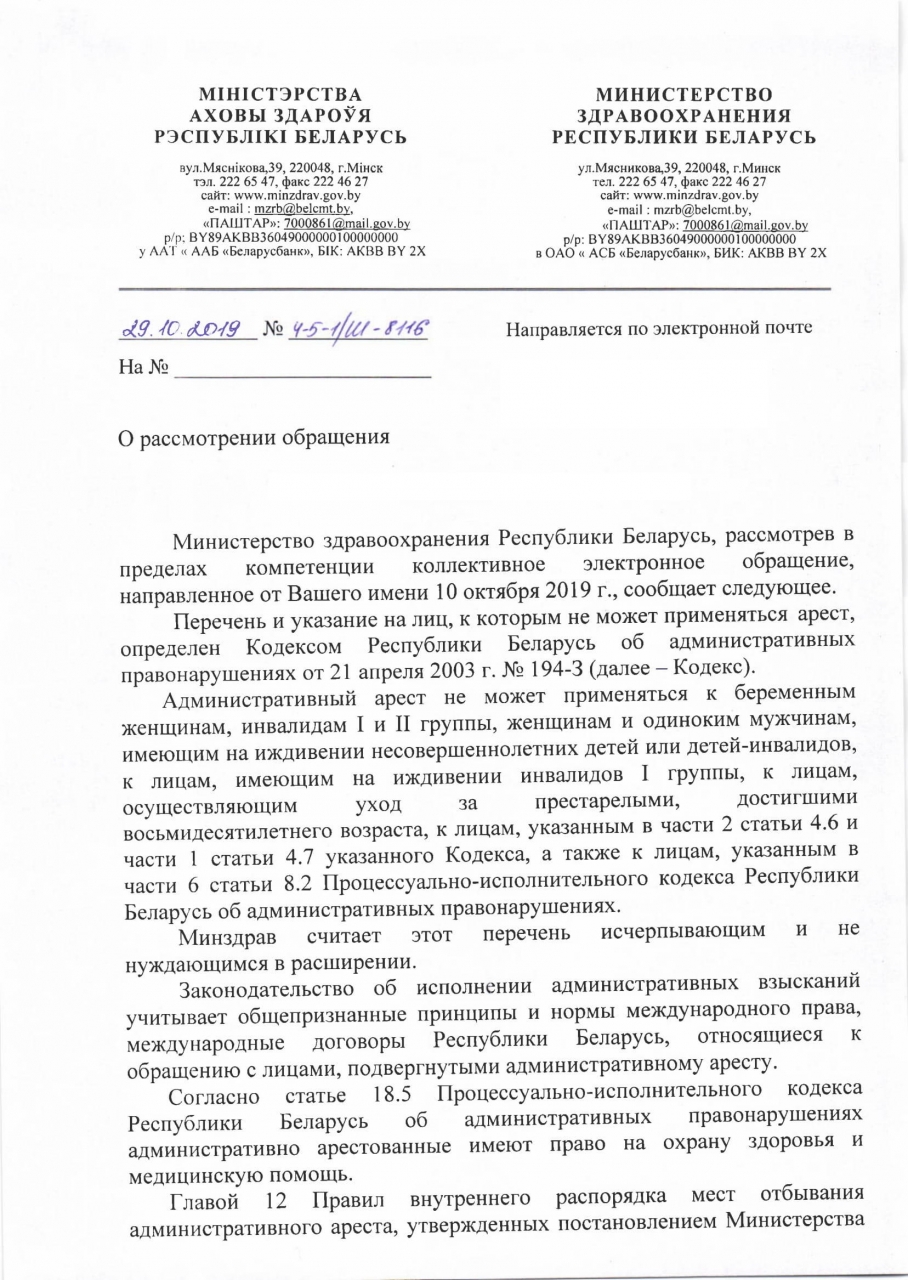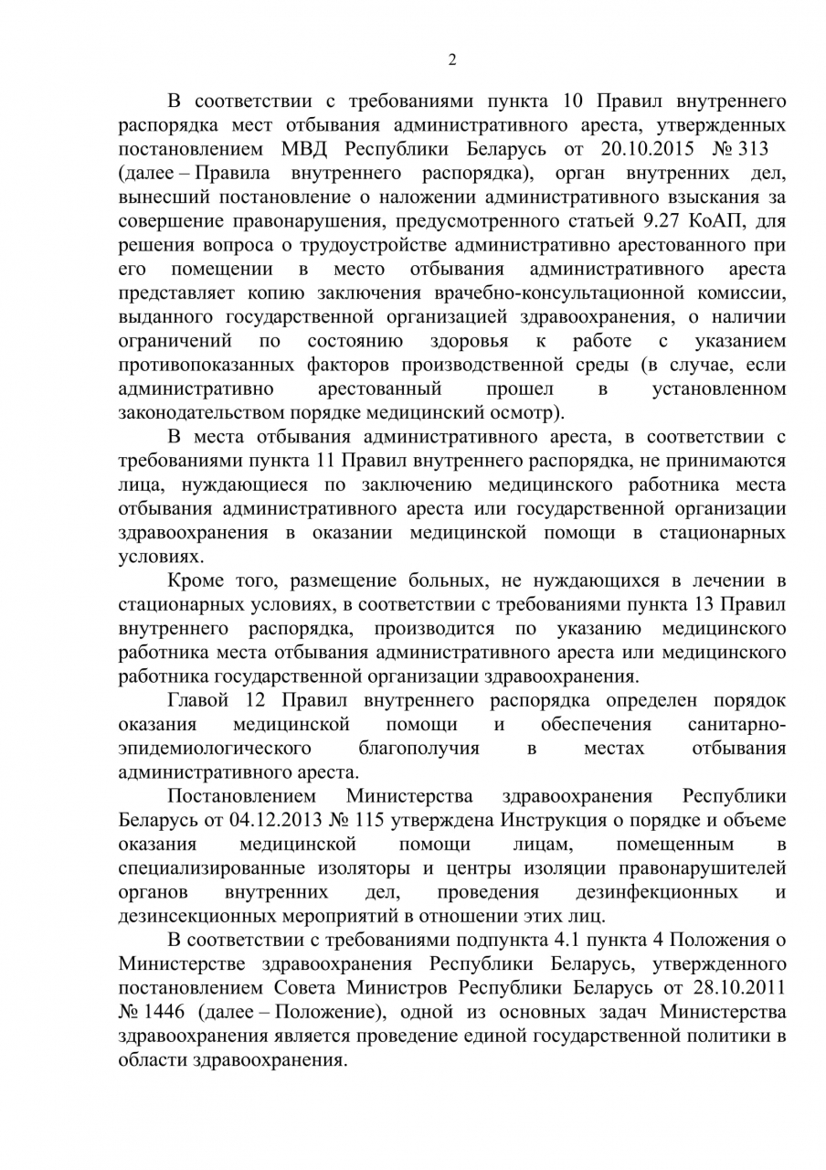 В Республике Беларусь, полагаем, на данный момент отсутствует должное обращение с лицами, подвергнутыми административному аресту, более того, даже при наличии должного ухода и обеспечения условий для арестованных, при некоторых заболеваниях нахождение под арестом может угрожать жизни человека, а также существенно повлиять на состояние его здоровья.