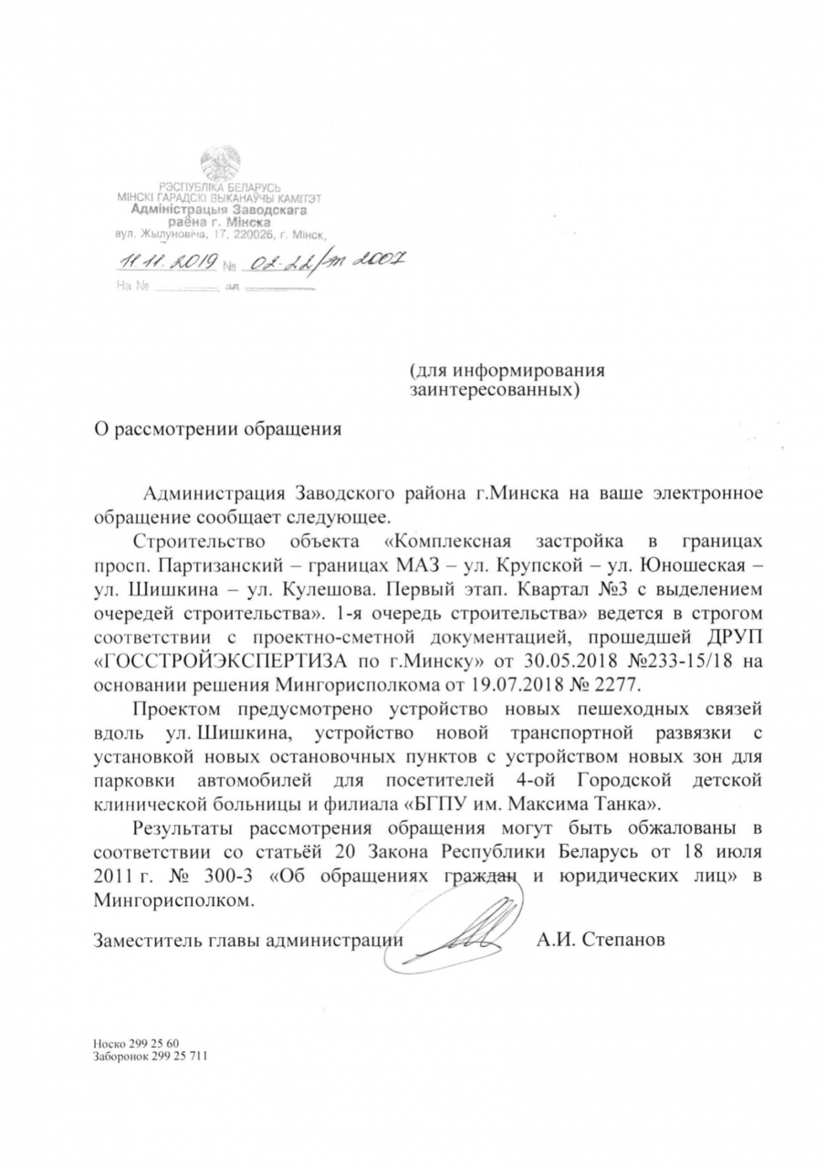 Проектом "Комплексная застройка в границах пр-т Партизанский - ул.Кулешова. Первый этап. Квартал №3 с выделением очередей строительства" предусмотрено устройство новой транспортной развязки.