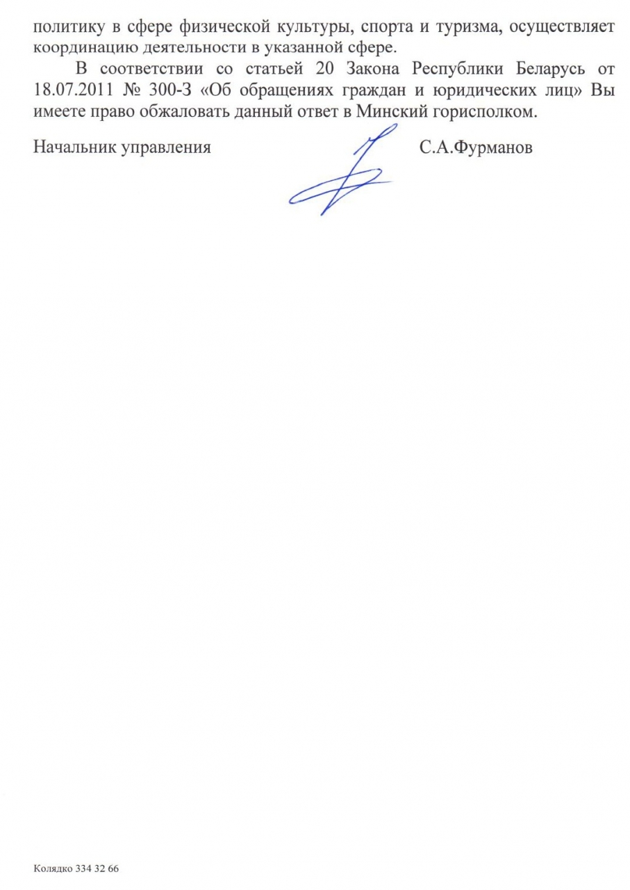 - подписал: Начальник управления спорта и туризма Мингорисполкома Фурманов С.А.