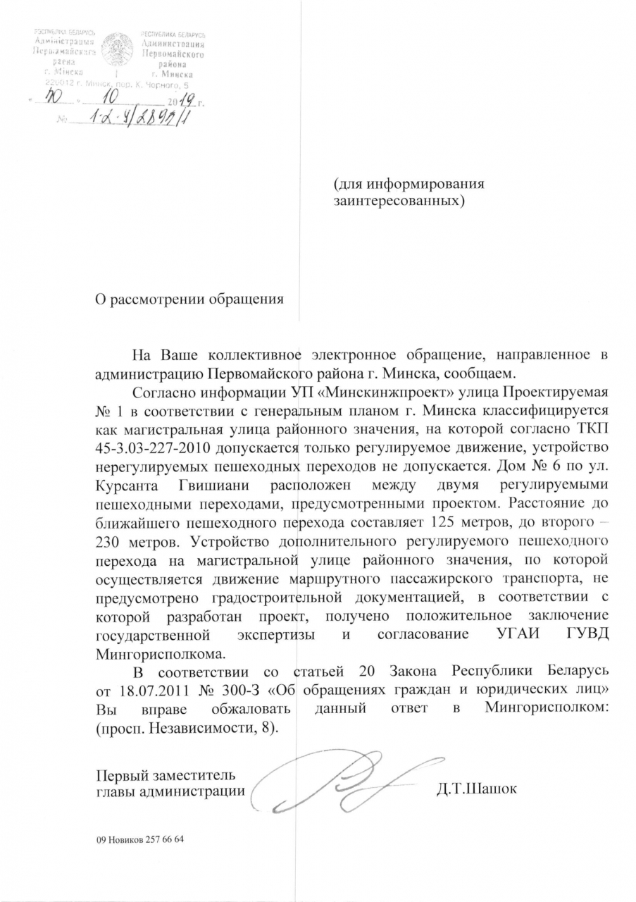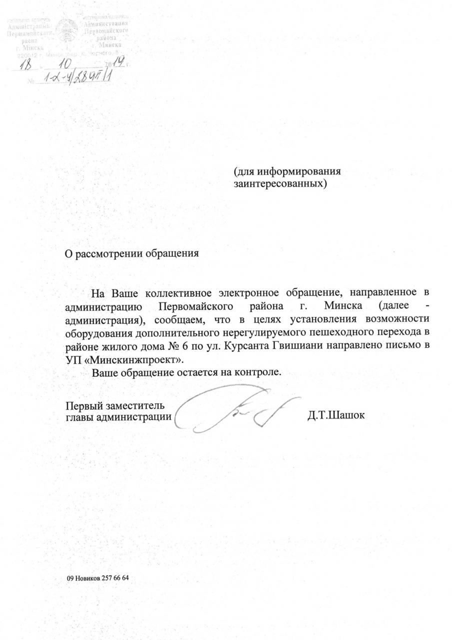 В целях установления возможности оборудования дополнительного нерегулируемого пешеходного перехода в районе жилого дома №6 по ул.Курсанта Гвишиани направлено письмо в УП "Минскинжпроект".