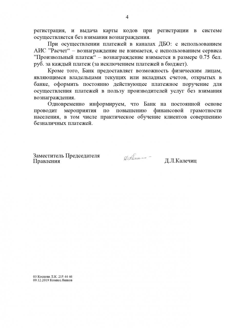 Мы просим запретить банкам брать баснословные комиссии за платежи в банках. В частности в ОАО «АСБ Беларусбанк» и не только, по нашим данным, за каждый платеж берут 2 рубля. Половина листика не может стоить 2 рубля, поскольку, по нашему мнению, размер комиссии не должен составлять более 10 копеек. Подобные комиссии являются достаточно затратными для людей, особенно пенсионеров.