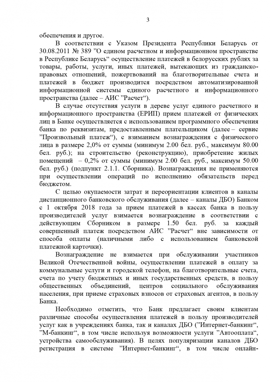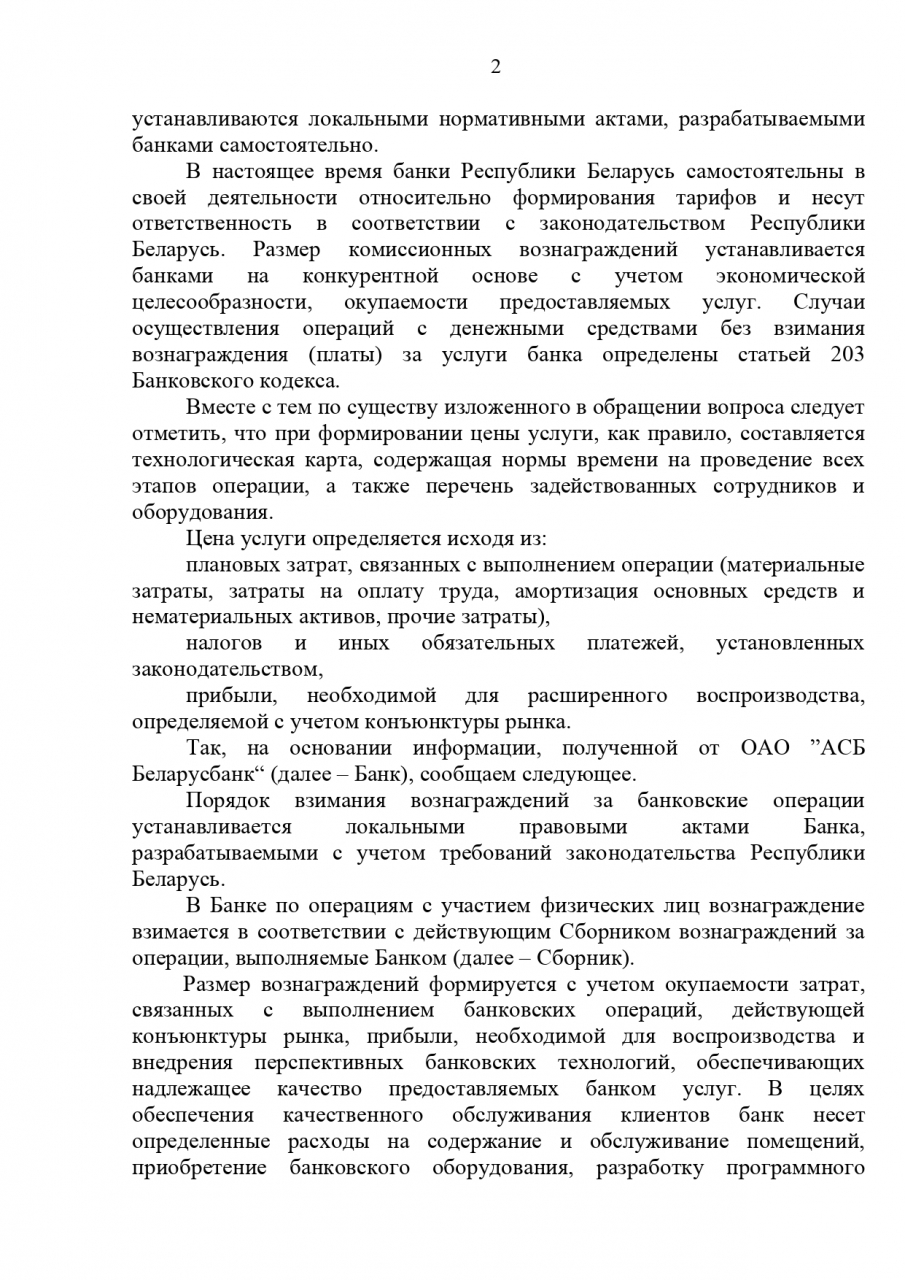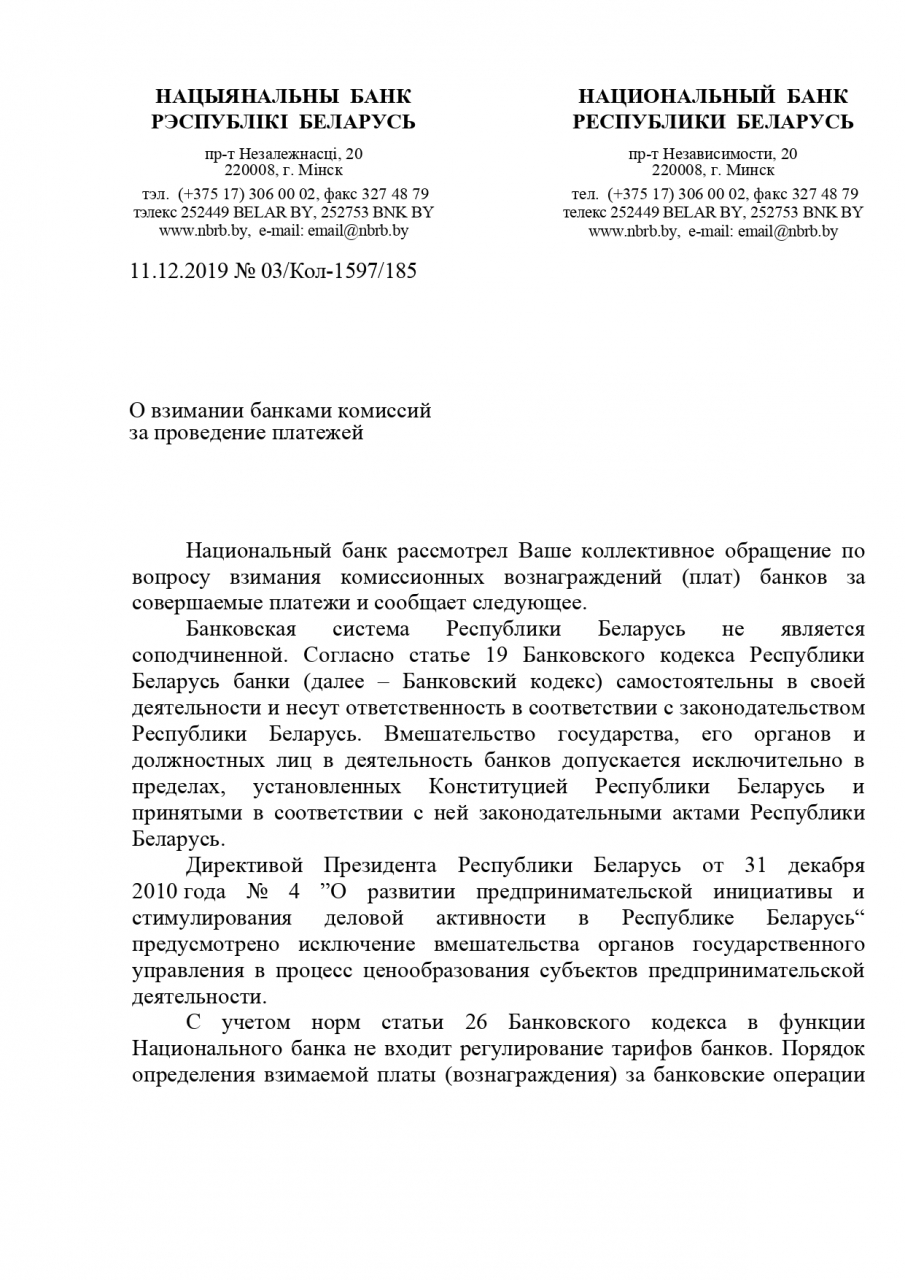 В настоящее время банки Республики Беларусь самостоятельны в своей деятельности относительно формирования тарифов и несут ответственность в соответствии с законодательством. Размер комиссионных вознаграждений устанавливается банками на конкурентной основе с учетом экономической целесообразности, окупаемости предоставляемых услуг.