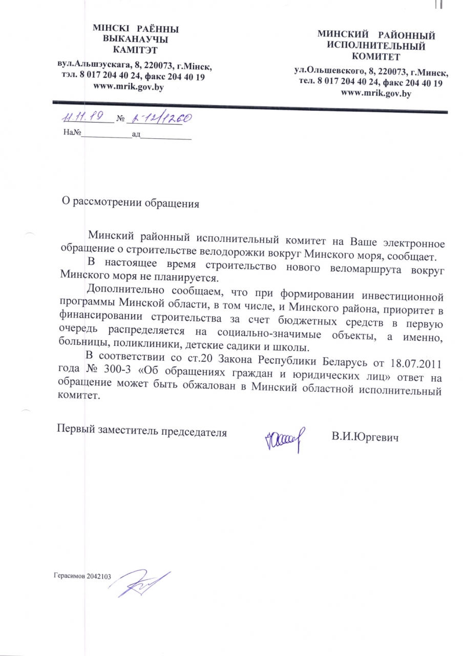 В связи с изложенным просим помочь зародившемуся велодвижению в нашей стране и реализовать такой масштабный проект как велодорожка вокруг всего Минского моря. Пускай не сразу весь, с отдельными участками, но сделать в течение двух-трёх лет.