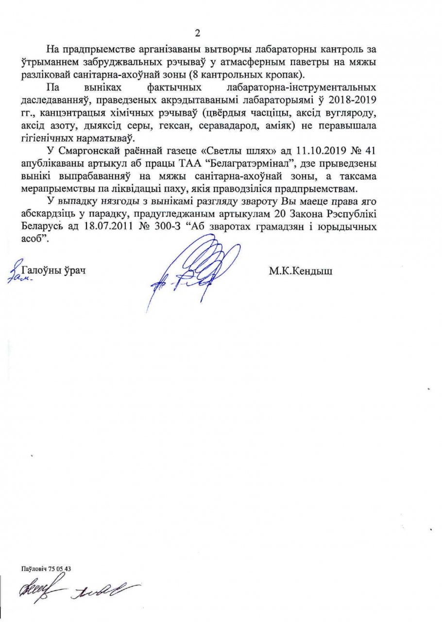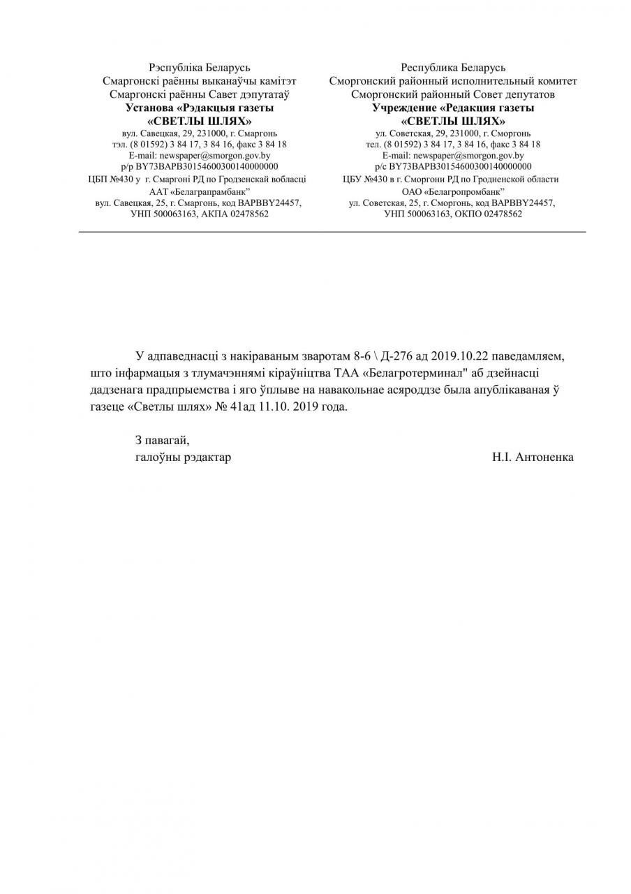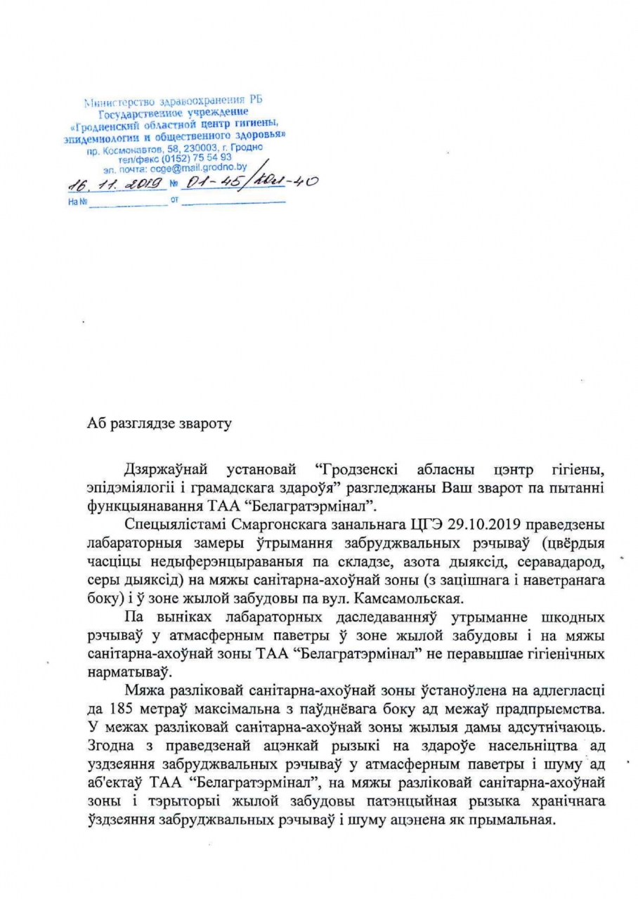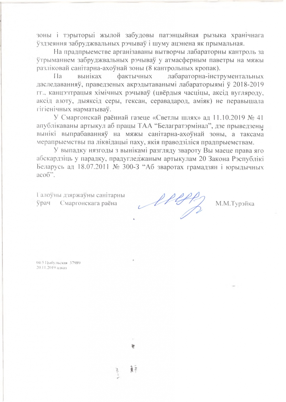 Iнфармацыя з тлумачэннямі кіраўніцтва ТАА «Белагротерминал» аб дзейнасці дадзенага прадпрыемства і яго ўплыве на навакольнае асяроддзе была апублікаваная ў газеце «Светлы шлях» ад 11.10.2019 №41.