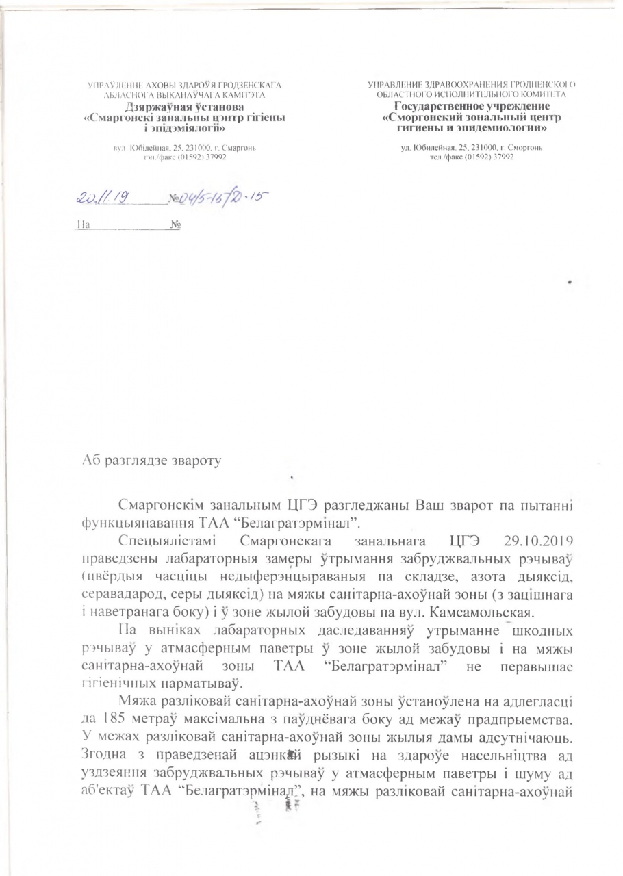 Звяртаем Вашу ўвагу, што, па нашых назiраннях, з вытворчасці, верагодна, ААТ “Белагратэрмінал” па Смаргоні распаўсюджваецца непрыемны, брыдкі пах. Пры адпаведным накірунку ветра ён пакрывае не толькі раён вуліц Трактарная, Багушэвіча, Савецкая, але распаўсюджваецца ў цэнтры горада, мікрараёне “Усходні”, на вуліцы Камінскага.
