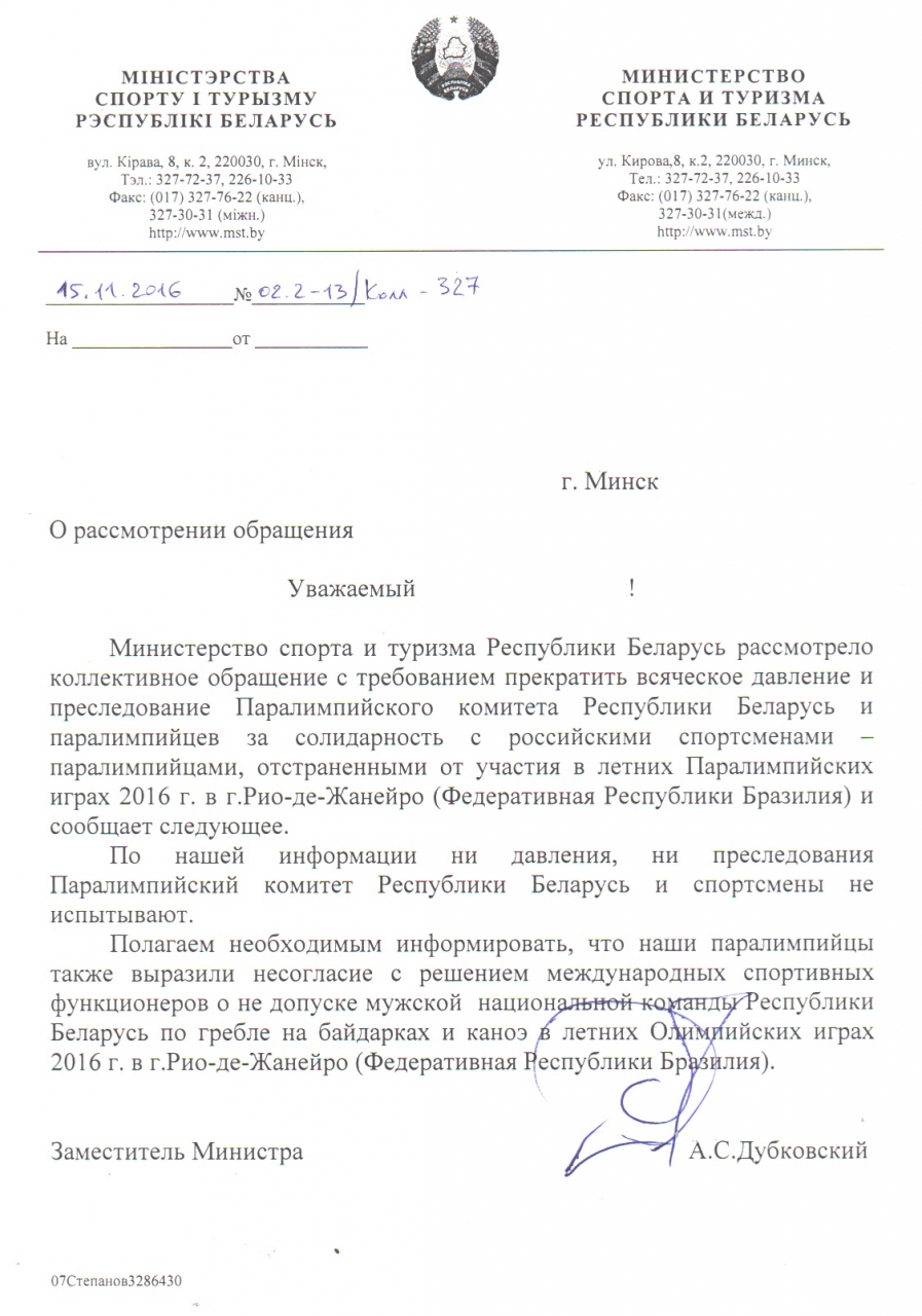 Мы, граждане и жители РБ, требуем прекратить всяческое давление и преследование паралимпийского комитета РБ и паралимпайцев в целом,за их солидарность с Российскими паралимпийцеми, как со стороны власти так и со стороны опозиции. Мы считаем, что решение об отстранении от соревнований Российских спортсменов-паралимпийцев и возложение на них коллективной ответственности за не совершенные ими преступления противоречат базовым принципам международного права . Это бесчеловечно по отношению к почти тремстам спортсменов-паралимпийцев, которые абсолютно чисты и не были замешаны ни в каких допинговых скандалах.