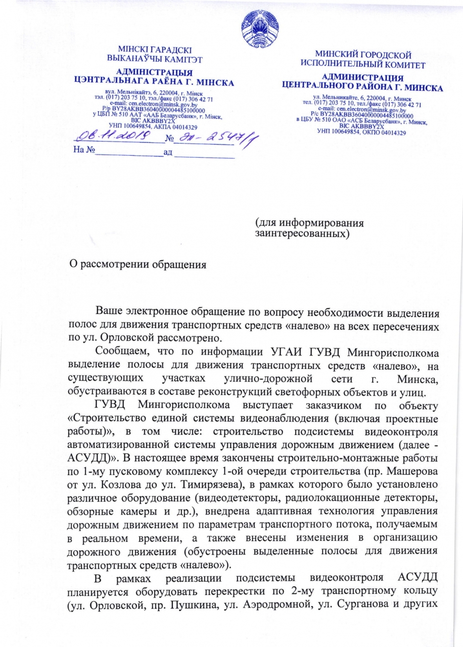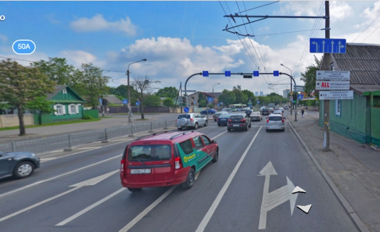 В Минске на улицах с многополосным движением с целью оптимизации транспортных потоков для поворота налево зачастую делают отдельную полосу "налево". Так, на ул.Орловской подобные полосы "налево" организованы при повороте на ул.Червякова и ул.Карастояновой при движении со стороны ул.Притыцкого.