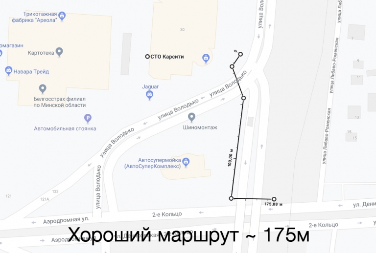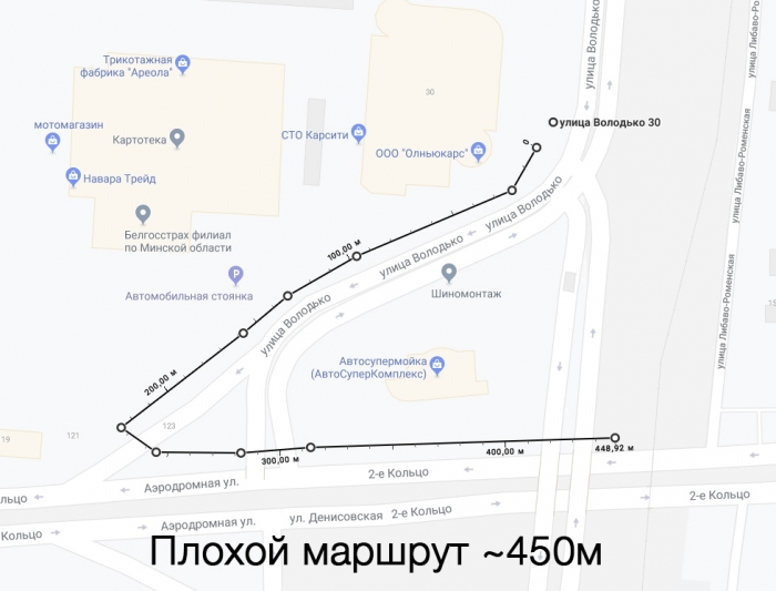 Поскольку в данном районе находится крупнейший торговый центр и много людей добираются до него пешком, то мы считаем, что доступный маршрут противоречит логике пешеходного движения в направлении торгового центра, а это может быть движение, например, к автобусной остановке или жилому массиву вблизи остановки «Козыревская». Более того, доступный маршрут не только в три раза длиннее, создаёт проблему для маломобильных граждан, но он и гораздо опаснее, поскольку проходит через два нерегулируемых пешеходных перехода и выезд с территории автоцентра. А также, при интенсивном движении пешеходов, особенно в часы пик, данный маршрут способен существенно затруднять движение по ул.Аэродромной для транспорта поворачивающего на ул.Володько, что создаст заторы на дороге.