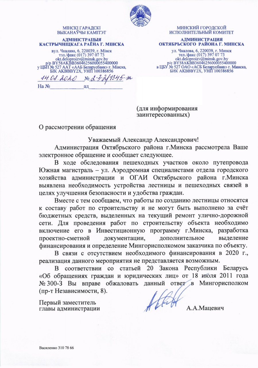 Специалистами отдела городского хозяйства администрации Октябрьского района г.Минска и ОГАИ Октябрьского района г.Минска выявлена необходимость устройства лестницы и пешеходных связей в целях улучшения безопасности и удобства граждан. В связи с отсутствием необходимого финансирования в 2020 г. реализация данного мероприятия не представляется возможным.