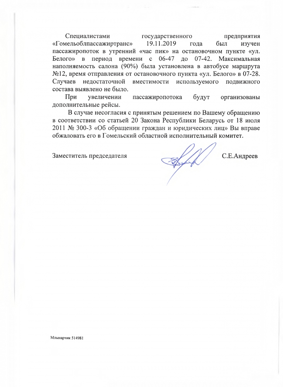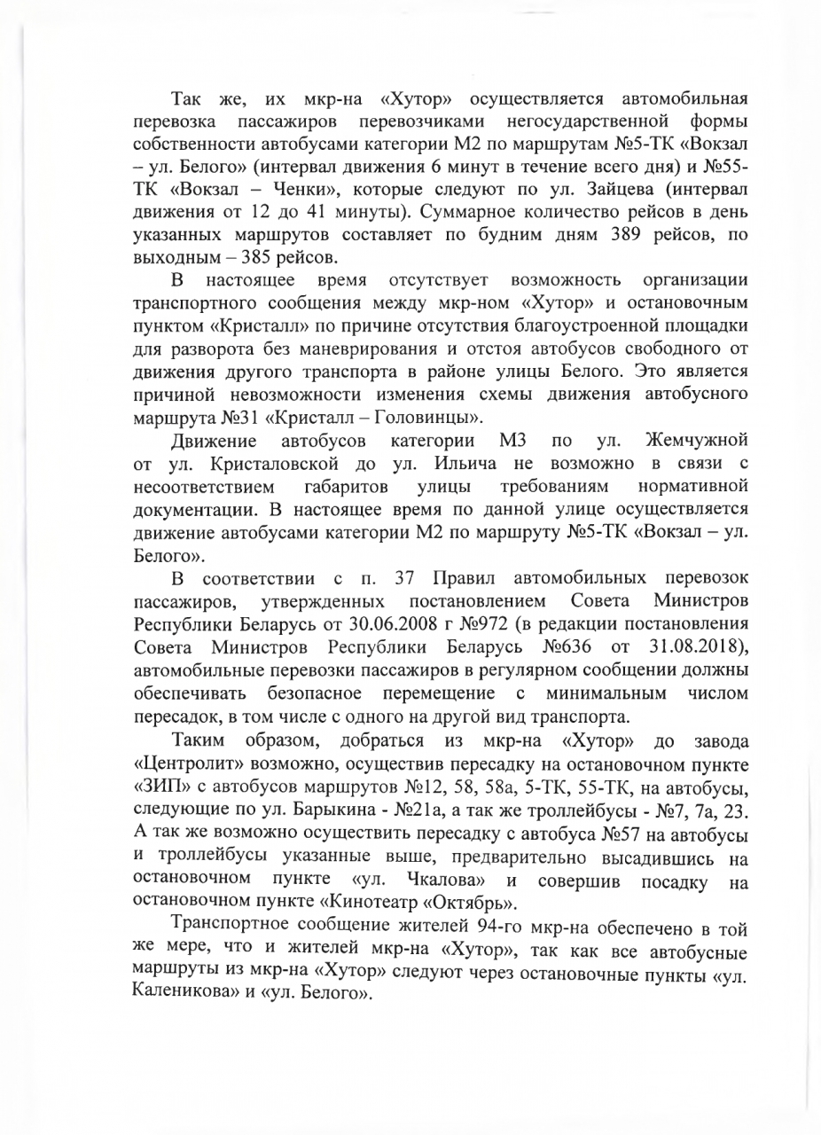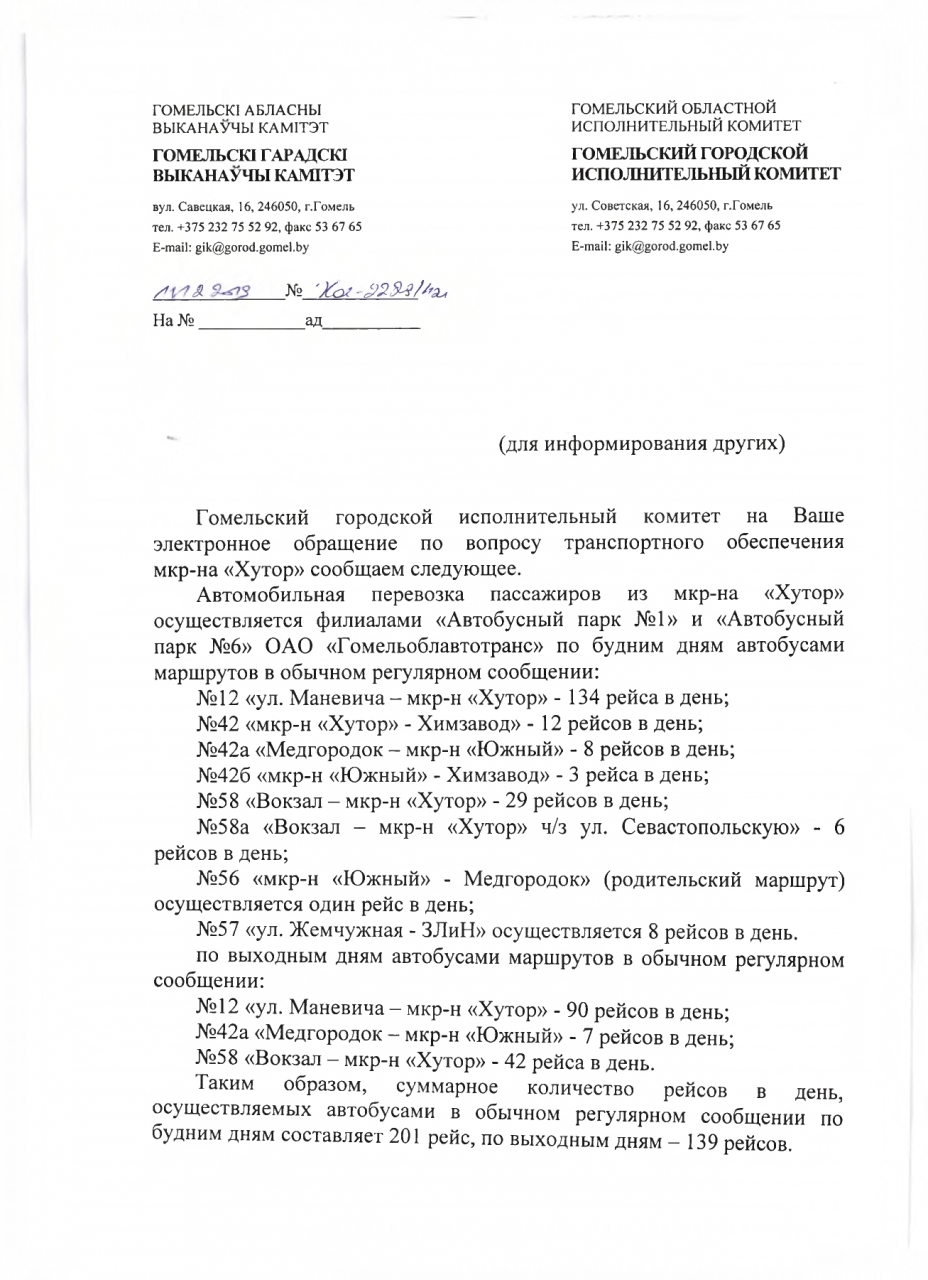 Поскольку согласно ст.41 Закона "О местном управлении и самоуправлении в Республике Беларусь" исполкомы в пределах своей компетенции в порядке, установленном законодательством, создают условия для предоставления транспортных услуг населению и организуют транспортное обслуживание граждан на соответствующей территории, мы предлагаем принять меры по решению проблем с транспортным сообщением, в том числе: