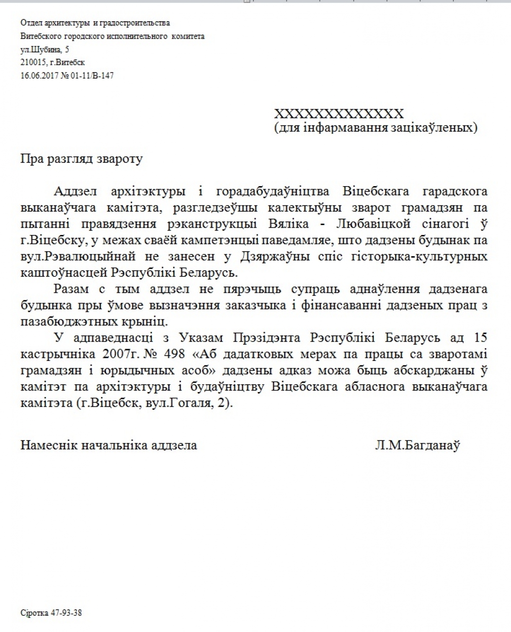 Вiцебскi выканкам не супраць аднаўлення дадзенага будынка, але пры ўмове вызначэння заказчыка і фінансаванні дадзеных прац з пазабюджэтных крыніц, бо дадзены будынак па вул.Рэвалюцыйнай не занесены у Дзяржаўны спiс гiсторыка-культурных каштоўнасцей Рэспублiкi Беларусь.