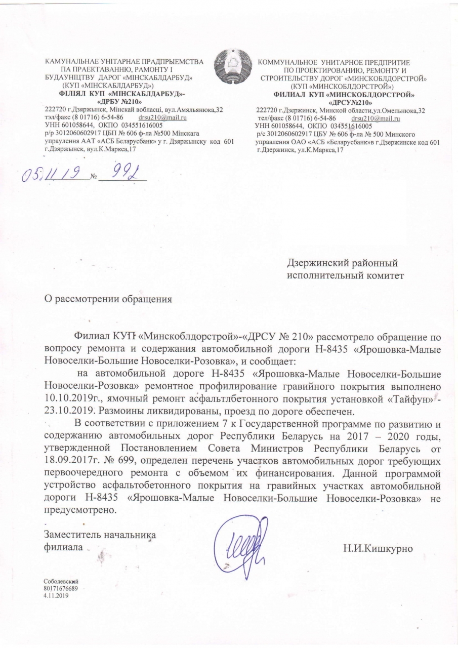 Госпрограммой по развитию и содержанию автодорог Республики Беларусь на 2017-2020 гг устройство асфальтобетонного покрытия на гравийных участках автодороги Н-8435 "Ярошовка - Малые Новоселки - Большие Новоселки - Розовка" не предусмотрено.