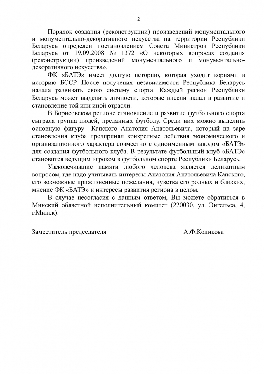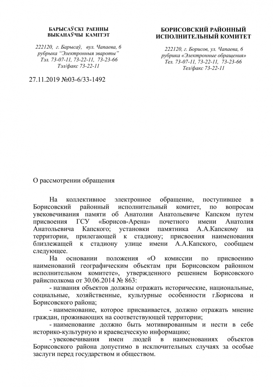 - внести предложение в Борисовский районный Совет депутатов о присвоении одной из улиц (или участка улицы), находящихся в непосредственной близости от данного стадиона, имя Анатолия Анатольевича Капского;