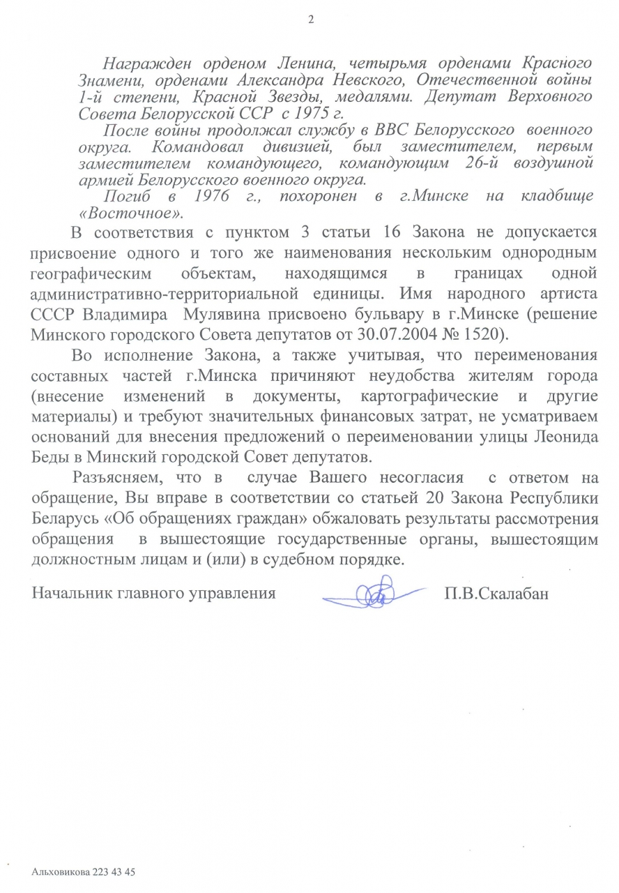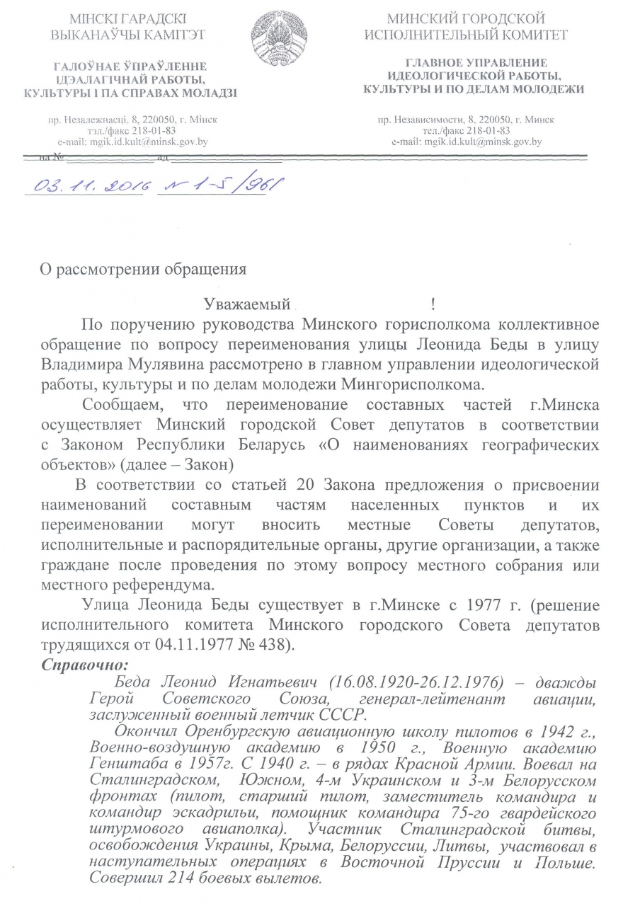 Предлагаем переименовать улицу Л.Беды на улицу В.Мулявина. Не может в современном городе улица называться Бедой, невзирая на все заслуги перед Родиной генерала Леонида Беды. К тому же жители данной улицы, скрашивая как могут незвучное название , именуют её улицей "Либиды". "Как корабль назовёте, так он и поплывет". Застройщики как могут получают для новостроек, стоящих на данной улице, другие адреса. Так например, недавно введенный в эксплуатацию 25-этажный дом с адресом Литературная 22, рядом многоподъездный дом с адресом улицы Белинского, несколько домов якобы на Восточной, в общем, НИКТО не хочет жить на улице БЕДЫ! Можно долго объяснять очевидное, но хочу отметить, что эта улица застраивается ударными темпами, здесь живёт большое количество детей, у которых вся жизнь впереди. И очень хочется, чтобы эти люди жили не на улице Беды, а на улице Счастья! Также вокруг нынешней Беды улицы названы в честь поэтов и писателей: Литературная, Богдановича, Некрасова, Достоевского, Тургенева, Ивана Мележа, Якуба Коласа и т.д. Уверена, что подавляющее количество жителей нынешней улицы Беды с одобрением воспримут переименование на улицу Владимира Мулявина, который жил на данной улице в доме 13. К тому же 2016 год в Беларуси - год культуры! А городская власть покажет, что работает в угоду жителям города и главный приоритет для неё - создание комфортной среды.