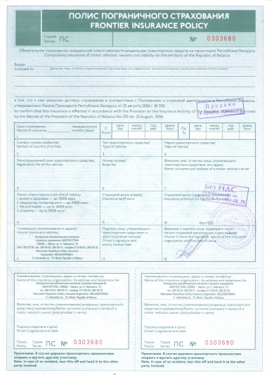 • дакументам устаноўленага ўзору, што сведчыць заключэнне дагавора пагранічнага страхавання, з'яўляецца страхавы поліс;