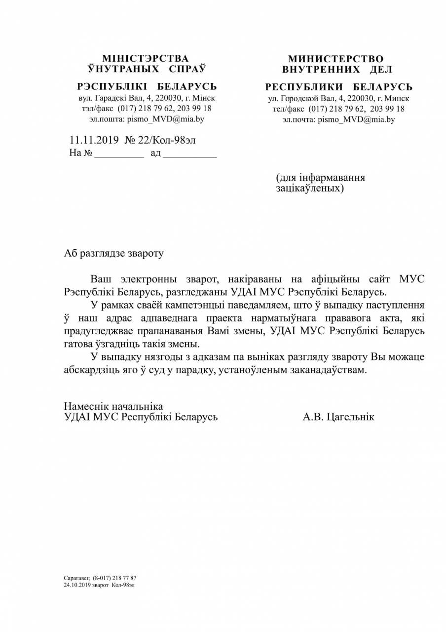 Адказы па сутнасці звароту і аб прынятых мерах просім даць у элетроннай форме ў вызначаны законам “Аб зваротах грамадзян і юрыдычных асоб” час.