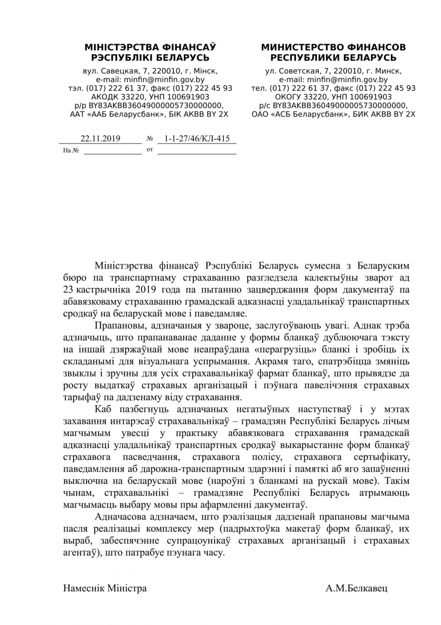 Магчымы ўвод у практыку абавязковага страхавання грамадскай адказнасцi уладальнiкаў транспартных сродкаў выкарыстанне форм бланкаў страхавога пасведчання, страхавога полiсу, страхавога сертыфiкату, паведамлення аб дарожна-транспартным здарэннi i памяткi аб яго запаўненнi выключна на беларускай мове.