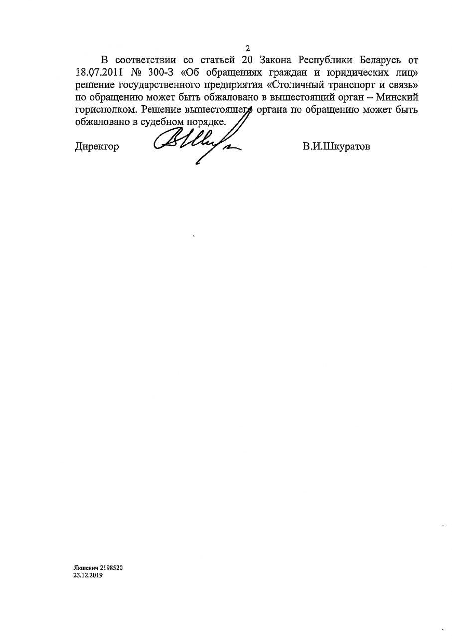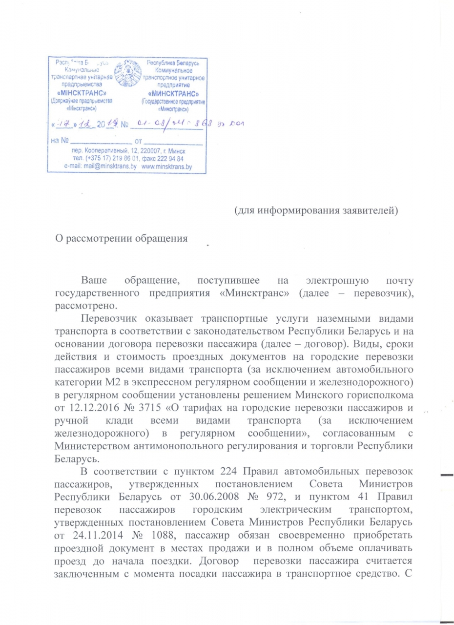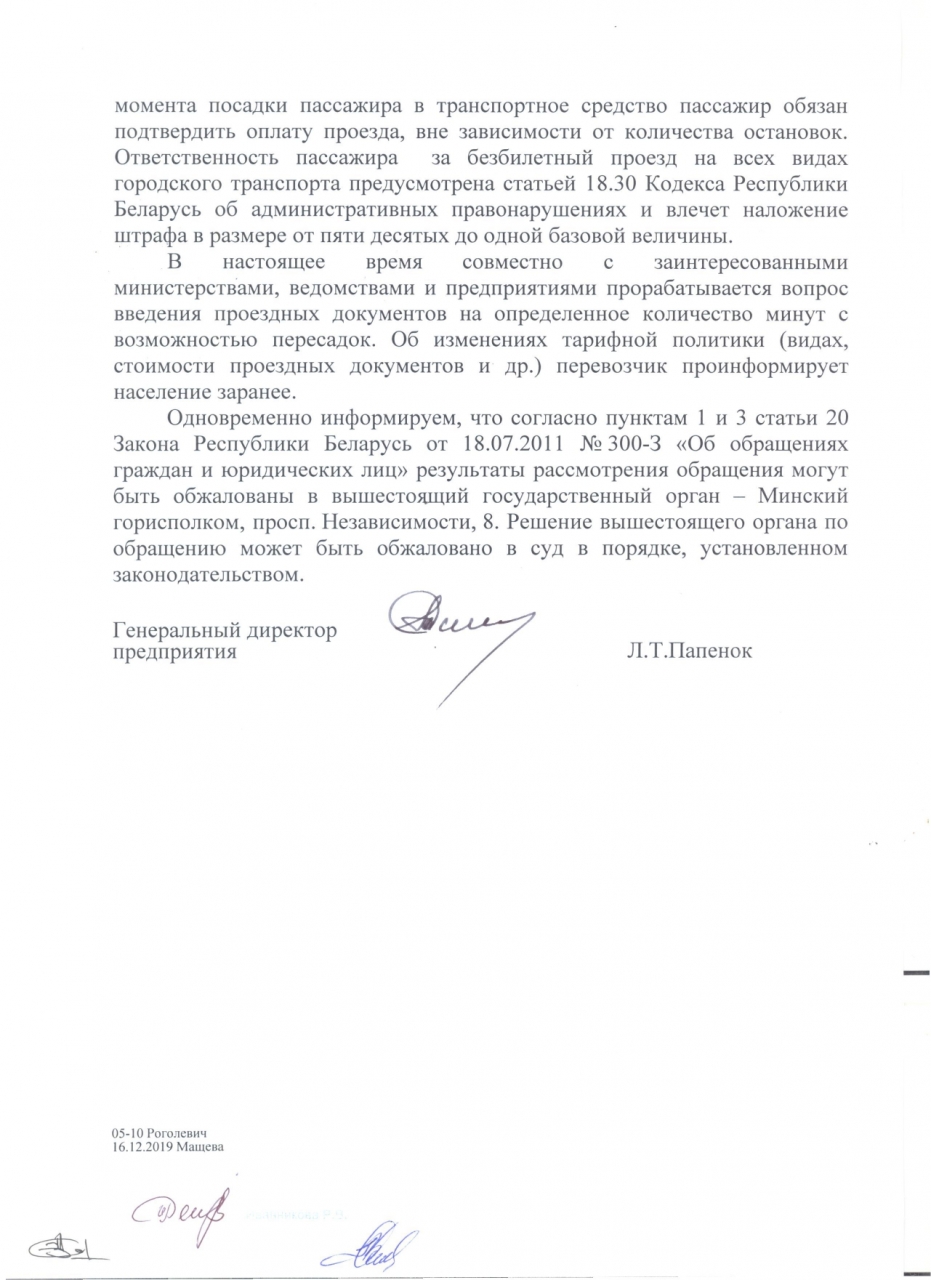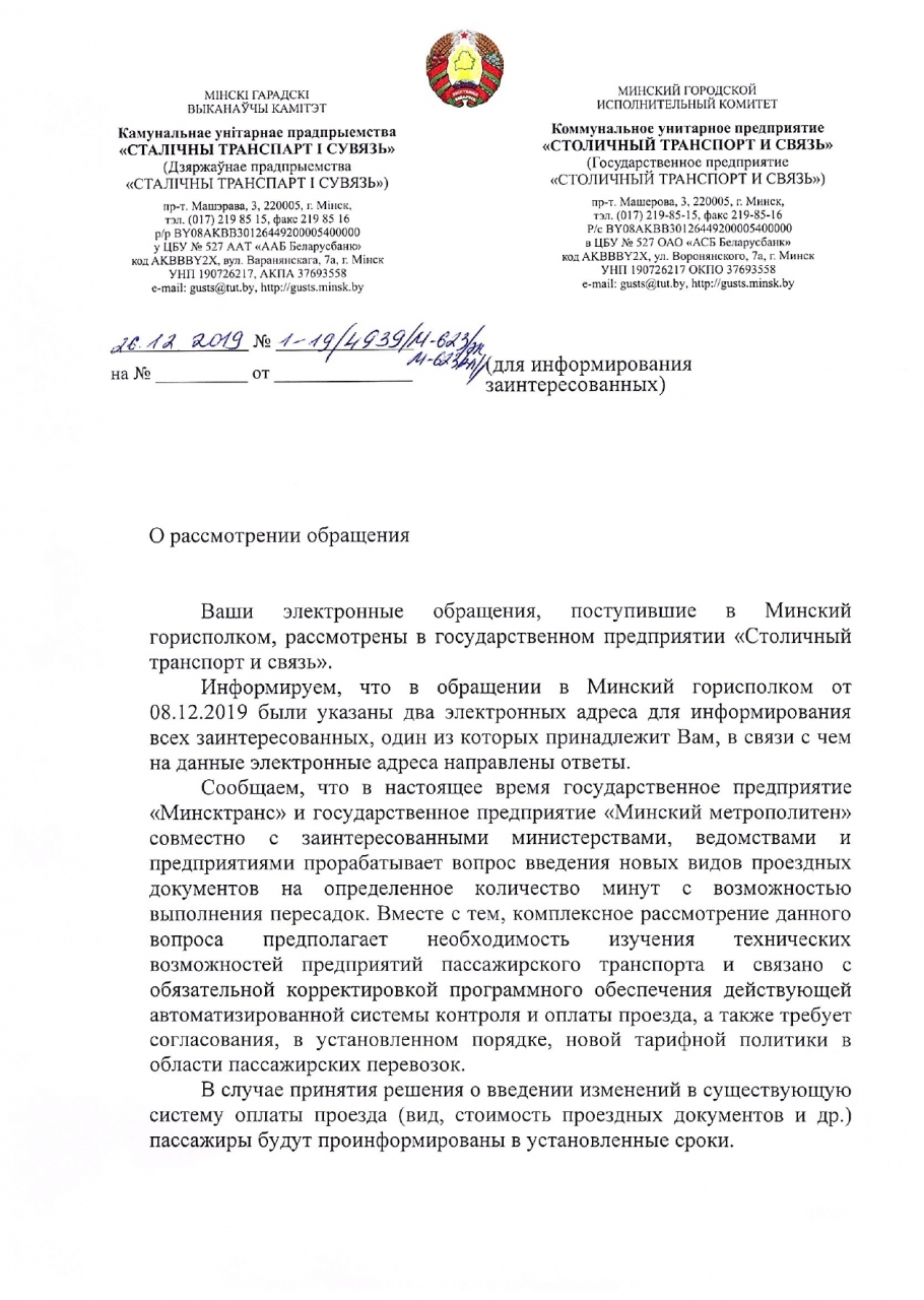 В связи с этим, основании ст.41 Закона "О местном управлении и самоуправлении в Республике Беларусь", которая устанавливает, что исполкомы в пределах своей компетенции в порядке, установленном законодательством, создают условия для предоставления транспортных услуг населению и организуют транспортное обслуживание граждан на соответствующей территории, просим Вас ввести новый тариф проезда в минском городском пассажирском транспорте на 20, 75 и 90 минут (либо иные лимиты в зависимости от времени передвижения транспорта от начального до конечного пункта), в который входили бы любые без исключение поездки на городском пассажирском транспорте в данный период времени без ограничения количества пересадок, а отсчёт времени фиксировался по отпечатанному на талоне времени валидатором в начале первой поездки.