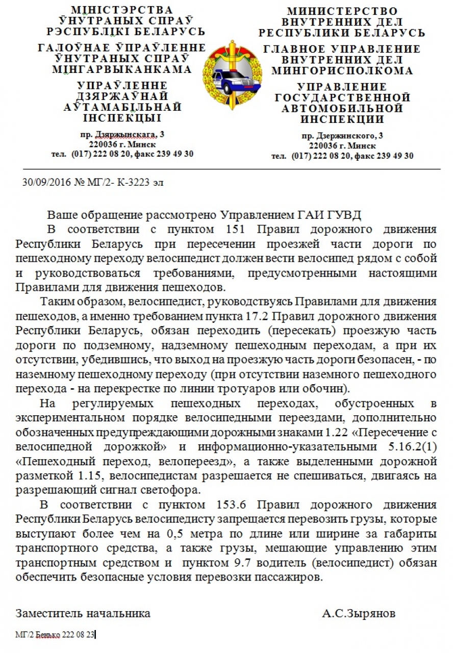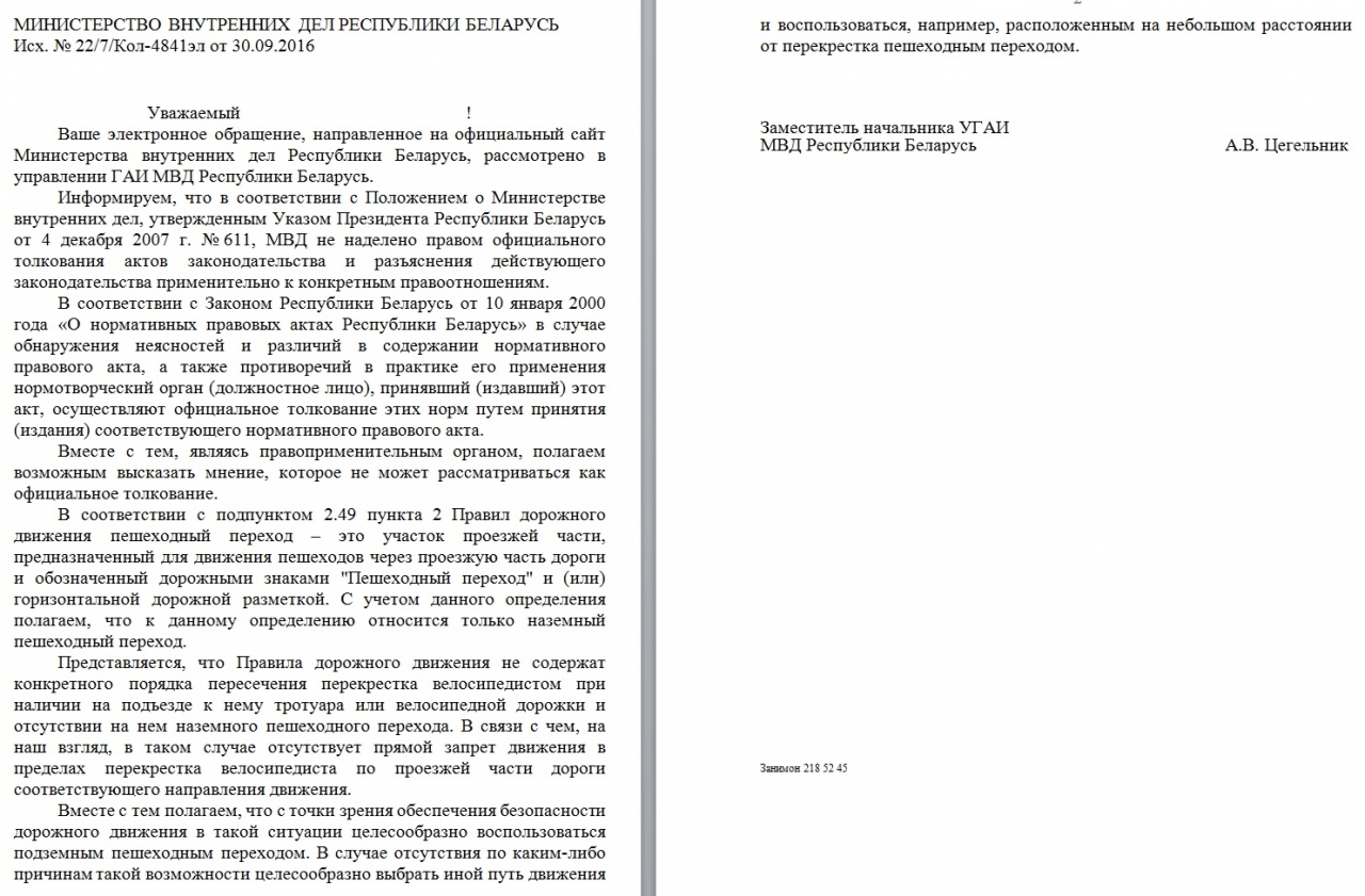 По моим личным наблюдениям в последнее время участились случаи пересечения перекрестков велосипедистами по проезжей части в тех местах, где нет наземного пешеходного перехода, но при этом имеется подземный пешеходный переход (пр. Независимости, Хоружей-Куйбышева и т.д.). На интернет-форумах и в социальных сетях многие велосипедисты оправдывают свои действия, ссылаясь на п. 148 ПДД и невозможность движения по тротуару, при этом подземный пешеходный переход они не принимают во внимание, поскольку в п. 151 говорится о «пешеходном переходе», а не о «подземного пешеходном переходе».