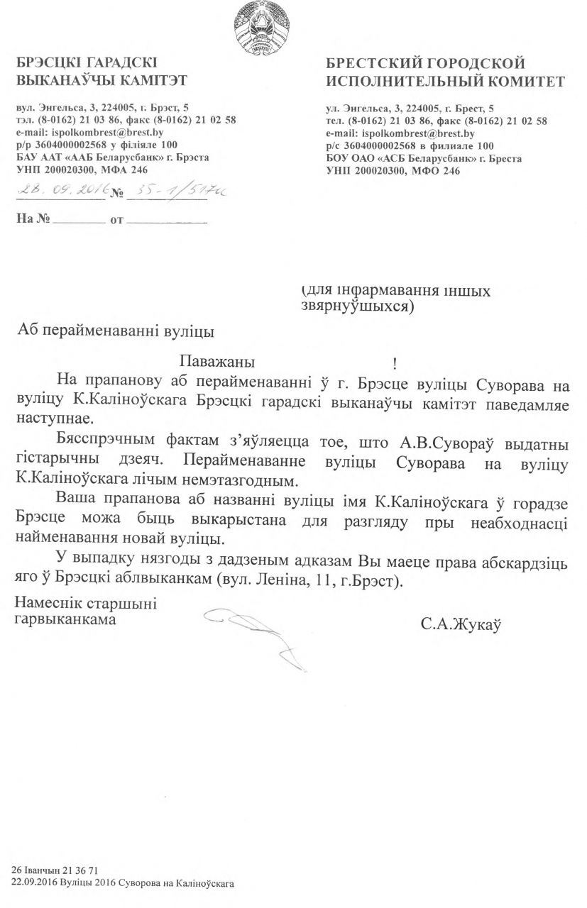 Мы, граждане Беларуси, жители города Бреста, считаем, что Суворов - преступник и палач, который под знаменем империализма порабощал белорусские земли. Суворов не герой для граждан Республики Беларусь, т.к. он был противником белорусской государственности, а значит, в том числе и современной Республики Беларусь. Следовательно, мы хотим, чтобы улице Суворова было присвоено новое название - улица К. Калиновского, в честь героя национально-освободительного движения и борца с царизмом Константина (Кастуся) Калиновского. Суворов является захватчиком, который пришел на нашу землю с целью держать простых белорусов в качестве крепостных. Считаем, что позор для нашего города в том, что в нем нет улицы борца с царизмом - Кастуся Калиновского.