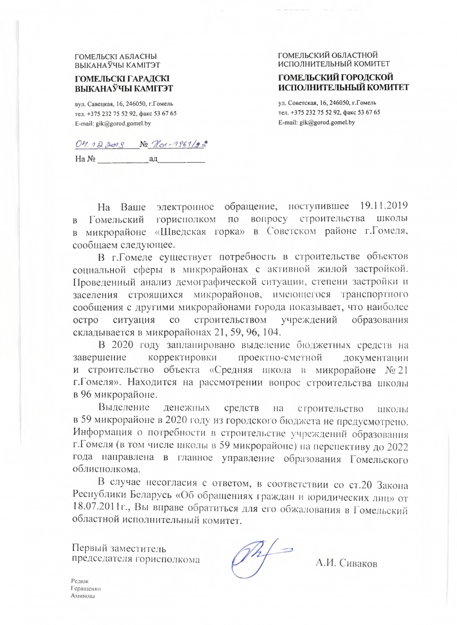 Выделение денежных средств на строительство школы в 59-м микрорайоне в 2020 г. не предусмотрено. Информация о потребности в строительстве школы в микрорайоне "Шведская горка" на перспективу до 2022 г. направлена в главное управление образования Гомельского облисполкома.