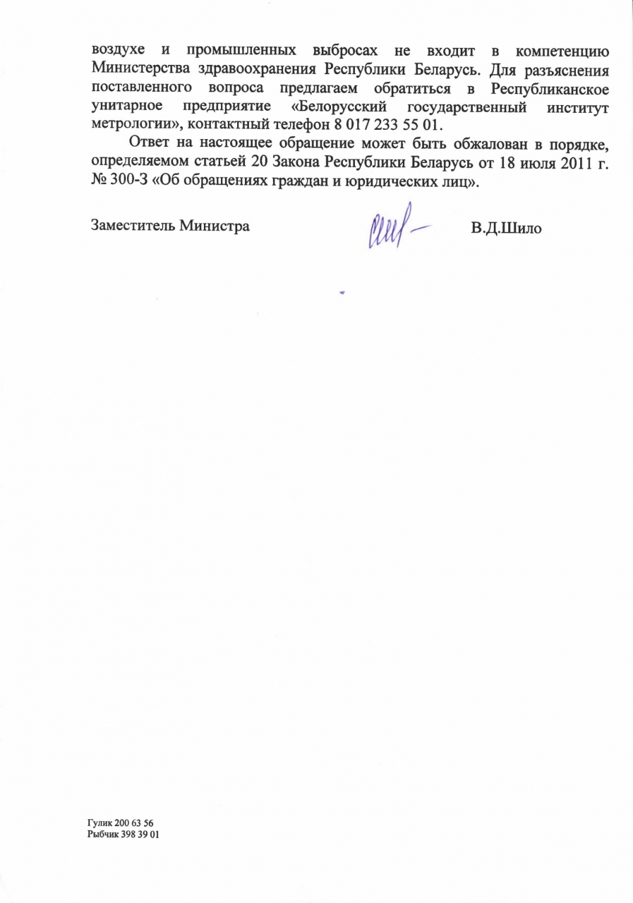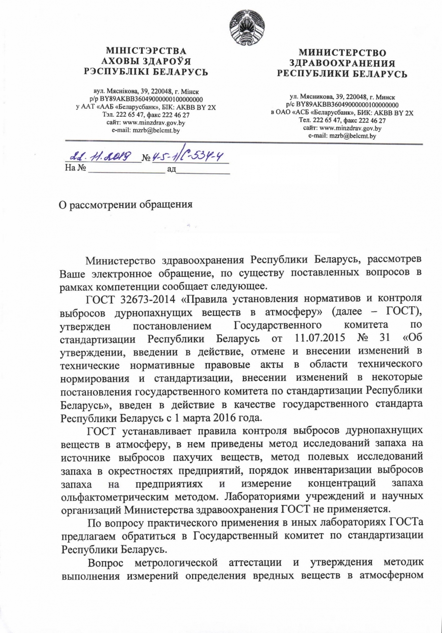 Ответ Минздрава от 20.09.2019 №4-5-1/С-534-3 на электронное обращение граждан о разработке и внедрении методики нормирования запаха в Республике Беларусь нуждается в уточнении, в том числе по следующим пунктам: