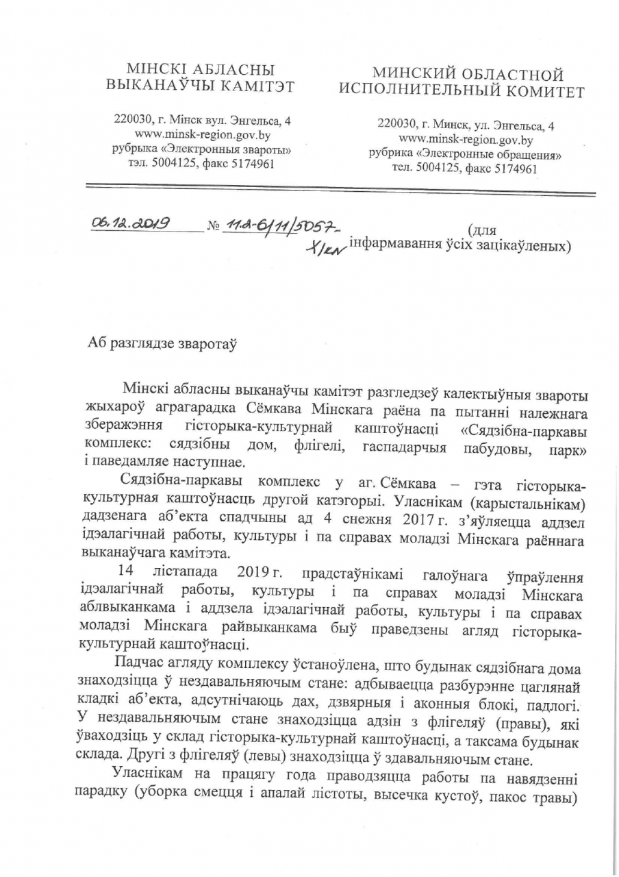 Мы, госцi i мясцовыя жыхары аграгарадка Сёмкава Мінскага раёна, а таксама неабыякавыя грамадзяне, якія ведаюць сёмкаўскі сядзібна-паркавы комплекс, звяртаемся з просьбай дапамагчы ў належным зберажэнні гісторыка-культурнай каштоўнасці.