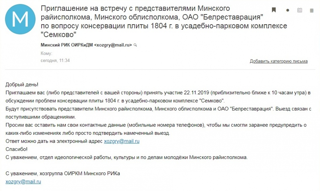 В усадебно-парковом комплексе "Семково" 22 ноября ближе к 10 часам утра состоится встреча с представителями Минского райисполкома, Минского облисполкома, ОАО "Белреставрация" по вопросу консервации плиты 1804 г. Заявителей просят предоставить контактные данные, чтобы заранее предупредить о каких-либо изменениях, либо просто подтвердить намеченный выезд, на электронный адрес [email protected].