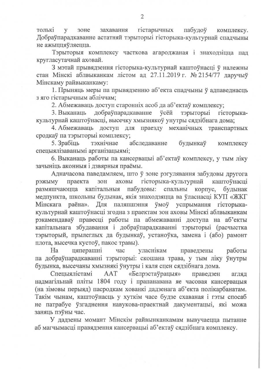 На падставе артыкула 41 Закона "Аб мясцовым кіраванні і самакіраванні", якая ўсталёўвае, што выканкамы праводзяць мерапрыемствы па ахове гісторыка-культурнай спадчыны, добраўпарадкаванне тэрыторыi, а таксама Палажэння аб Міністэрстве культуры, зацверджанага Пастановай Савета Міністраў Рэспублікі Беларусь ад 2017/01/17 N 40, якім да функцый Мінкультуры аднесена арганізацыя і садзейнічанне правядзенню мерапрыемстваў па ахове гісторыка-культурнай і археалагічнага спадчыны, просім звярнуць увагу на гэты аб’ект. Са свайго боку, з мэтай належнага захавання комплексу, прапануем наступнае: