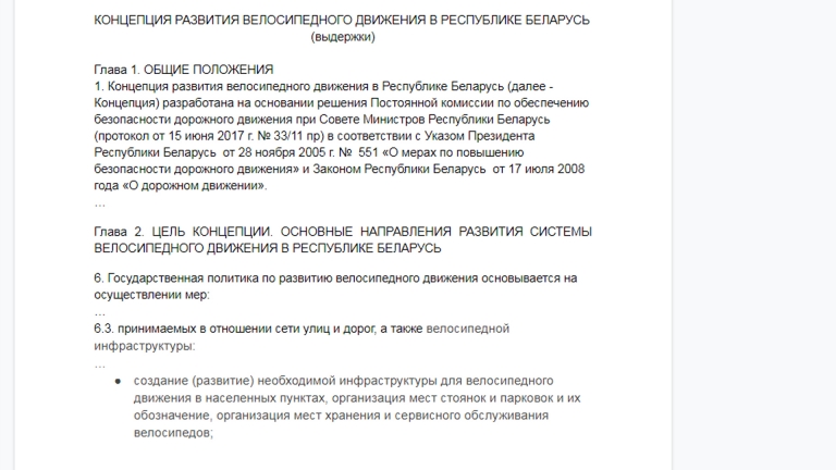 В соответствии с реализацией основных положений Концепции развития велосипедного движения в Республике Беларусь, разработанной на основании решения Постоянной комиссии по обеспечению безопасности дорожного движения при Совете Министров Республики Беларусь (протокол от 15 июня 2017 г. № 33/11 пр) в соответствии с Указом Президента Республики Беларусь от 28 ноября 2005 г. № 551 «О мерах по повышению безопасности дорожного движения» и Законом Республики Беларусь от 17 июля 2008 года «О дорожном движении», государственная политика по развитию велосипедного движения основывается на осуществлении мер по созданию необходимой инфраструктуры для велосипедного движения в населенных пунктах, организации мест стоянок и парковок и их обозначению.