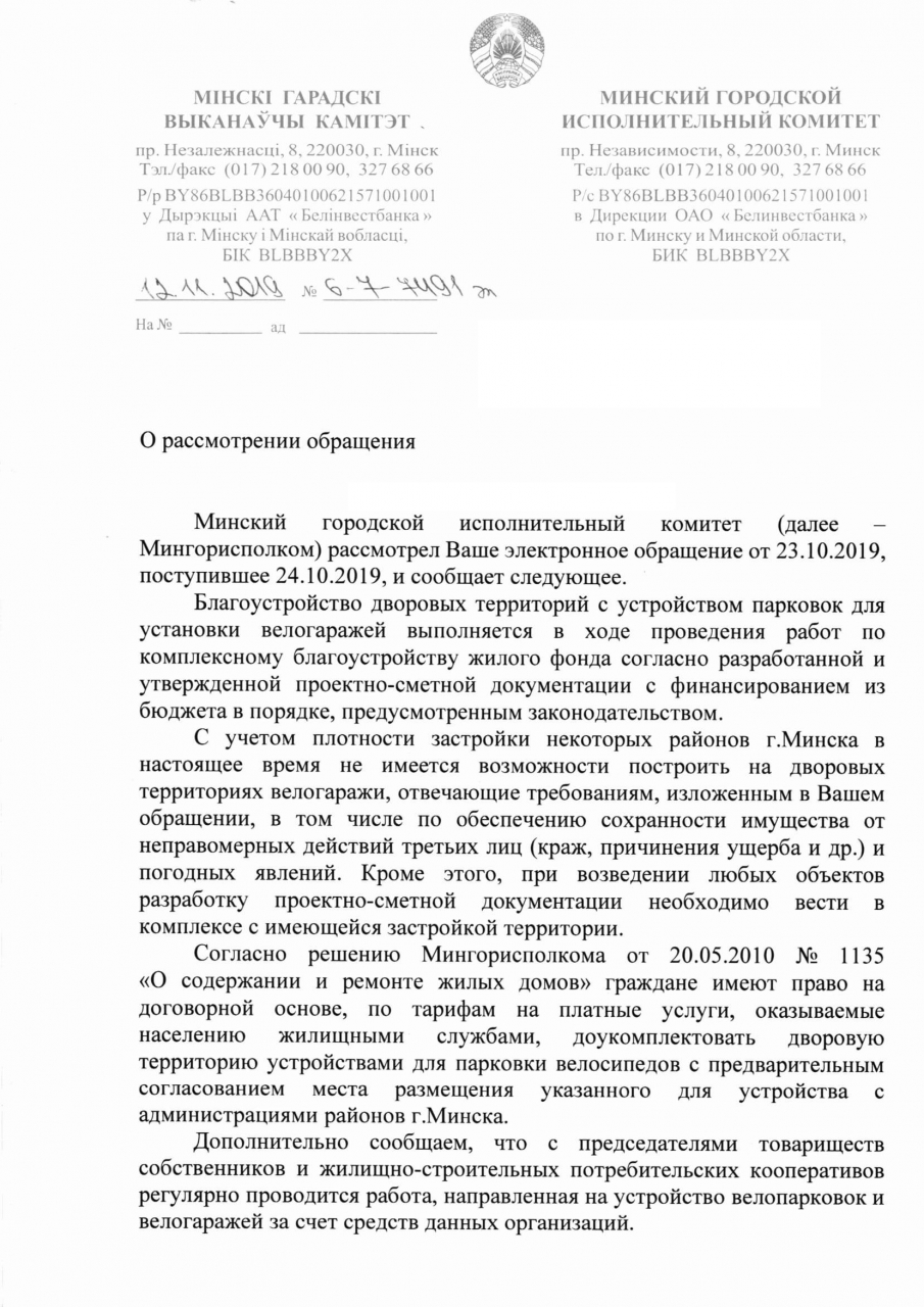 В связи с этим просим в течение 3-4 лет создать 1000 велогаражей во дворах Минска, обеспечивающих сохранность двухколесного транспорта от краж и неблагоприятных погодных условий.