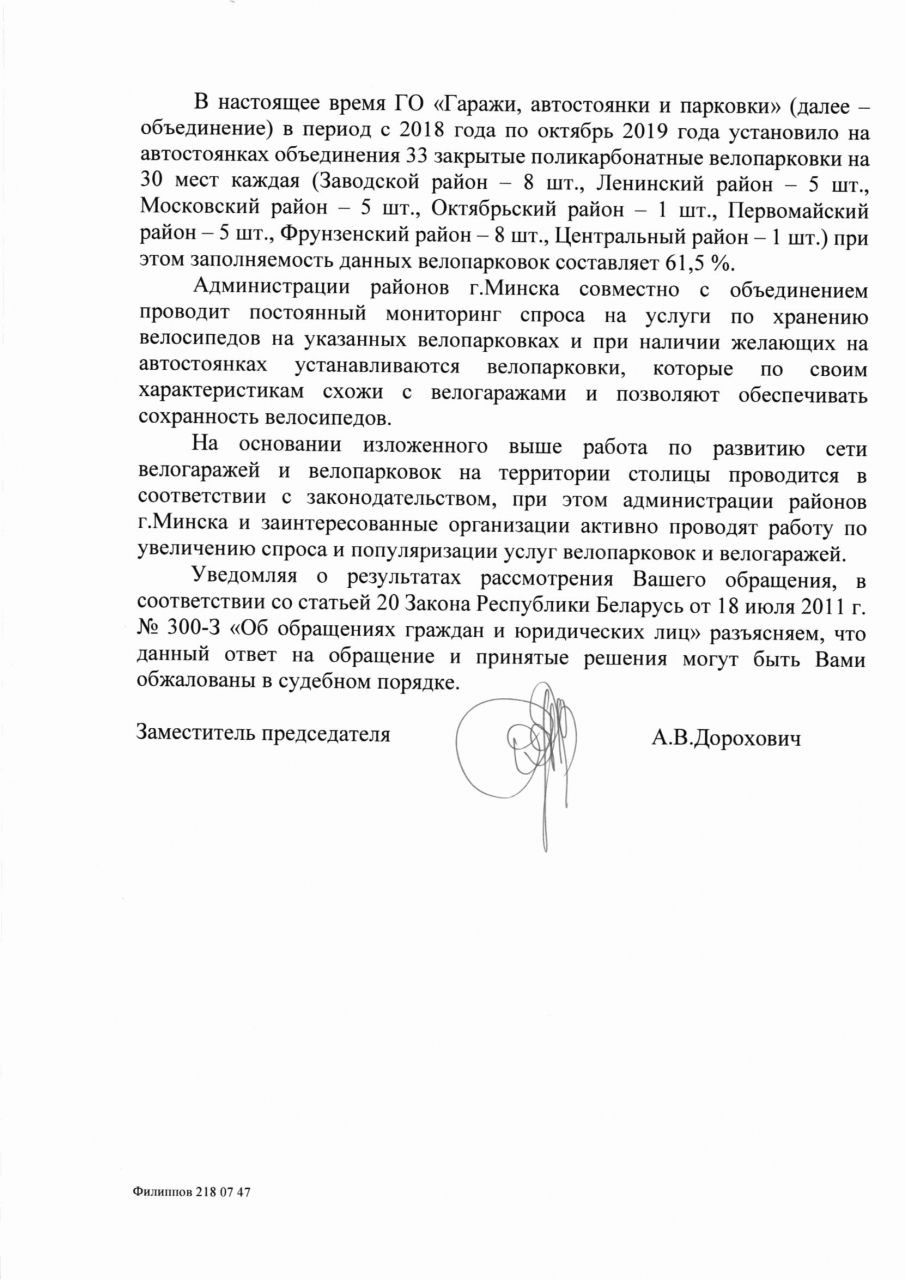 Работа по развитию сети велогаражей и велопарковок проводится в соответствии с законодательством, районные администрации и заинтересованные организации активно проводят работу по увеличению спроса и популяризации услуг велопарковок и велогаражей.