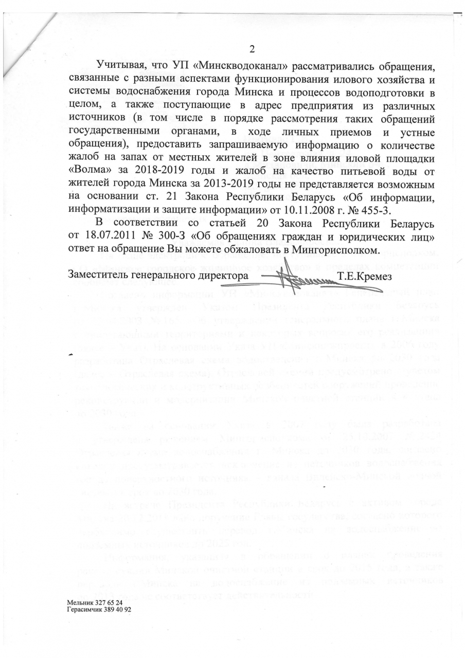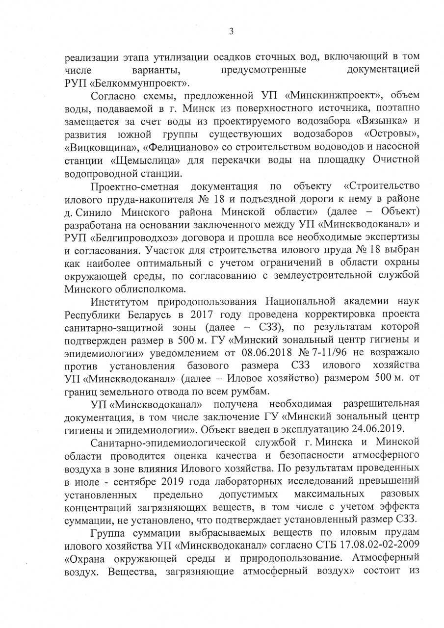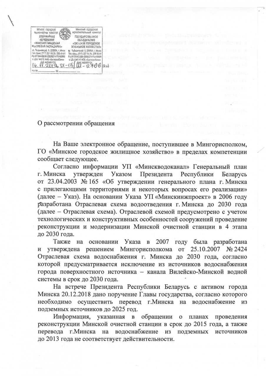 Далее в ответе есть целый один абзац касательно первой претензии о неисполнении поручения Министра ЖКХ перевести Минск на артезианскую воду ещё в 2013 году. В данном абзаце, по нашему мнению, указаны лишь размытые планы на неопределённое будущее. Поэтому прошу ответить на следующие вопросы: