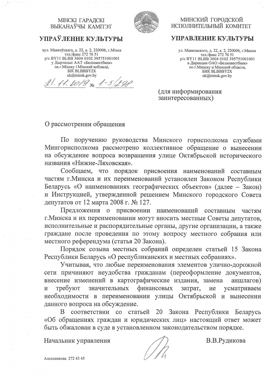 Руководствуясь ст.20 Закона "О наименованиях географических объектов", которая устанавливает, что предложения о присвоении наименований составным частям населённых пунктов и их переименовании могут вносить местные исполнительные и распорядительные органы, просим вынести на обсуждение вопрос о возвращении улице Октябрьская её исторического названия "Нижне-Ляховская".