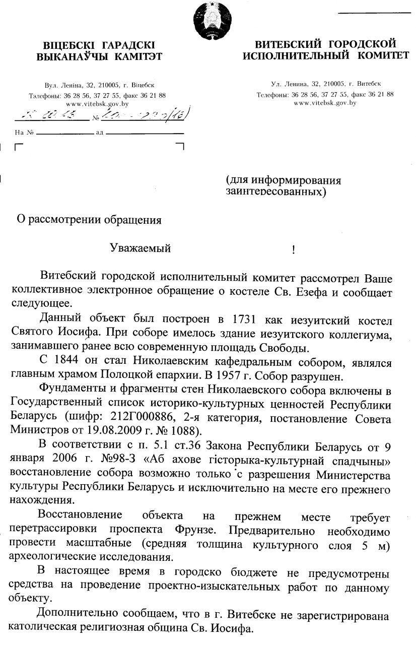 Поскольку проведение мероприятий по охране историко-культурного наследия статьей 41 Закона "О местном управлении и самоуправлении" отнесено к компетенции исполкомов, прошу местные власти вместе с католической общиной провести проектно-изыскательские работы и оценку возможности восстановления храма - костёла Св.Езефа, культового сооружения, памятника XVIII века, взорванного советской властью в 1956 году..